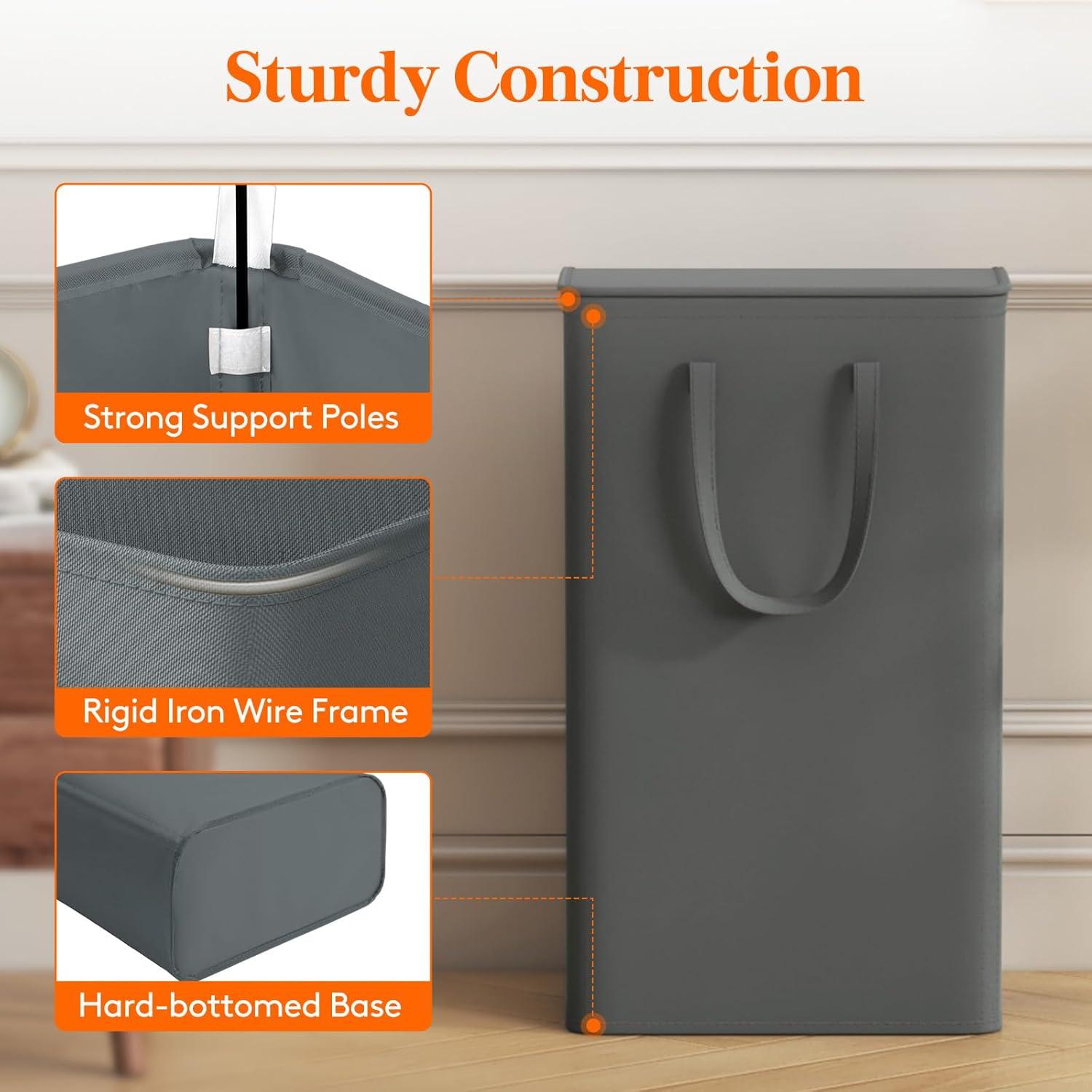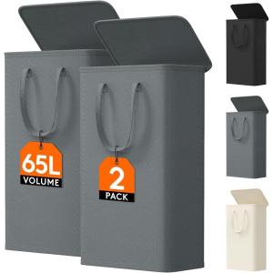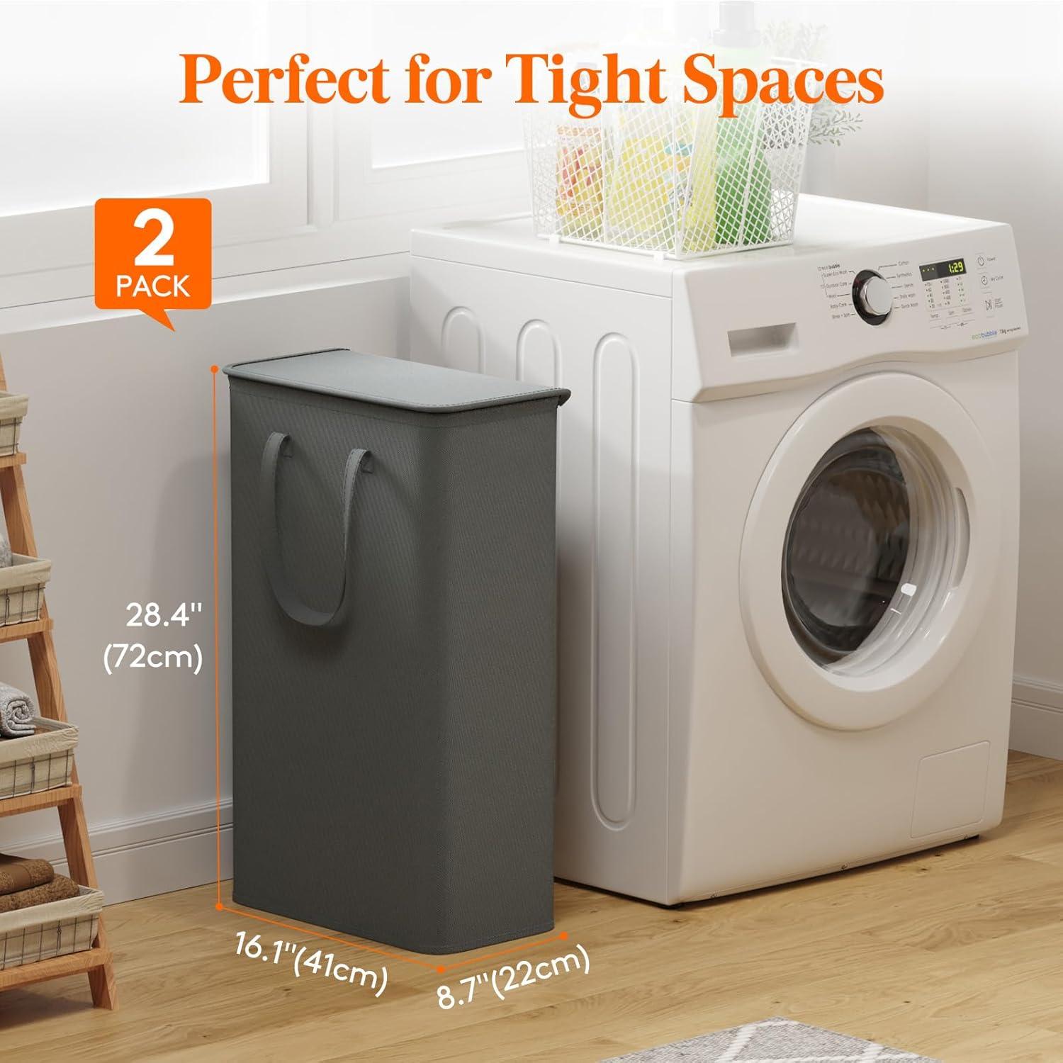 Lifewit 65L Slim Laundry Hamper, Small Laundry Basket with Lid, Dirty Narrow Collapsible Clothes Storage with Easy Carry Extended Handles, Tall Hampers for Bedroom Laundry Room, White, 2 Packs(Gray)