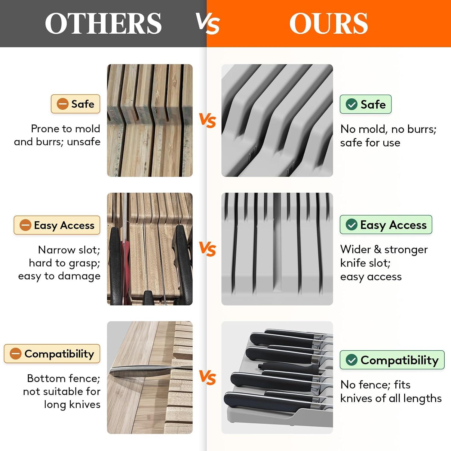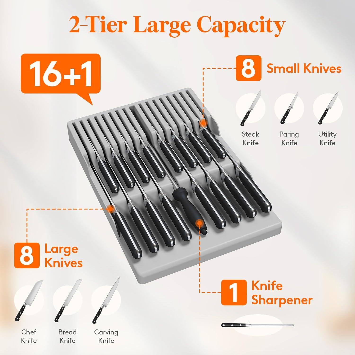 Lifewit Magnetic Drawer Knife Organizers Insert, Kitchen Plastic In Drawer Knife Block Slots for 16 Knives and 1 Sharpening Steel, Extra Large Steak Chefs Knives Holder Storage Sets, Gray(Gray)