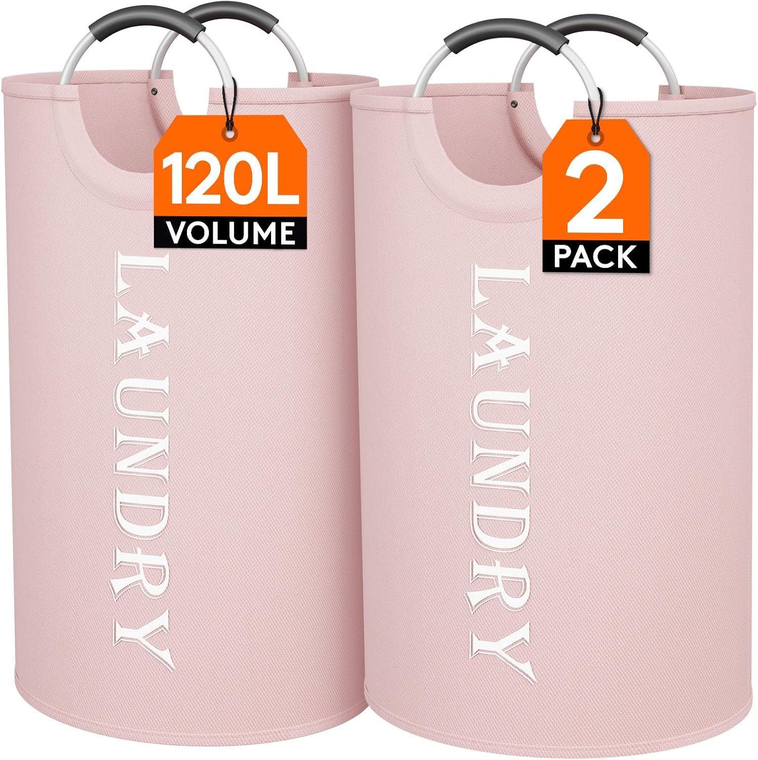 Lifewit 100L 2-Pack Large Laundry Basket, Collapsible Laundry Hamper with Aluminum Handles, Waterproof Freestanding Dirty Clothes Hampers for Laundry Room Bedroom Dorm Bathroom, Black(Pink)