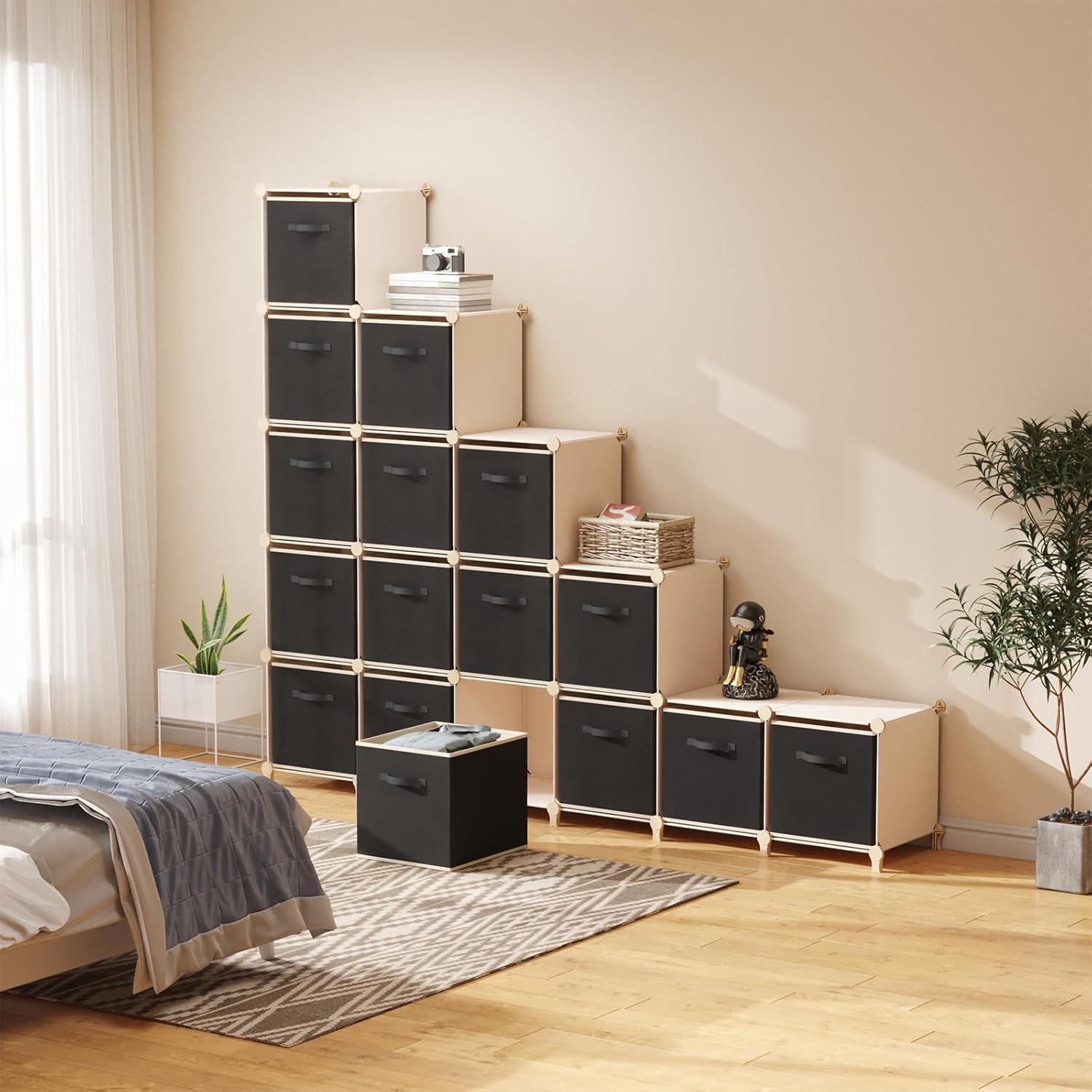 Package Includes: 10.5″L x 10.5″W x 11″H (18L) comes in 12 pack. You can rest assured that these foldable storage cubes will fit into most closet sizes.