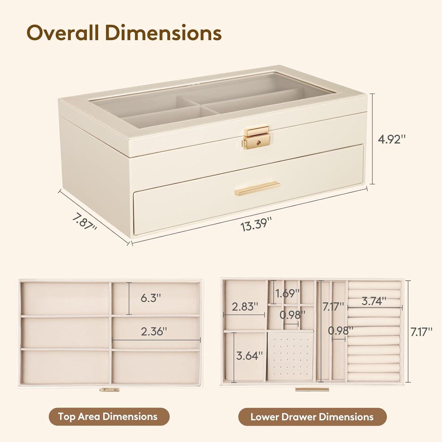 Double-Layer Design: 13.39″ x 7.87″ x 4.92″ with six compartments and removable dividers in the top layer provides organized storage for glasses and ample space for jewelry in the bottom layer