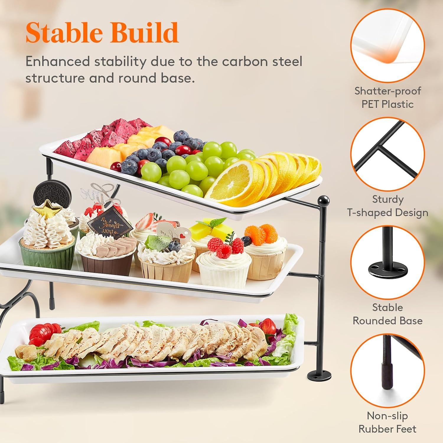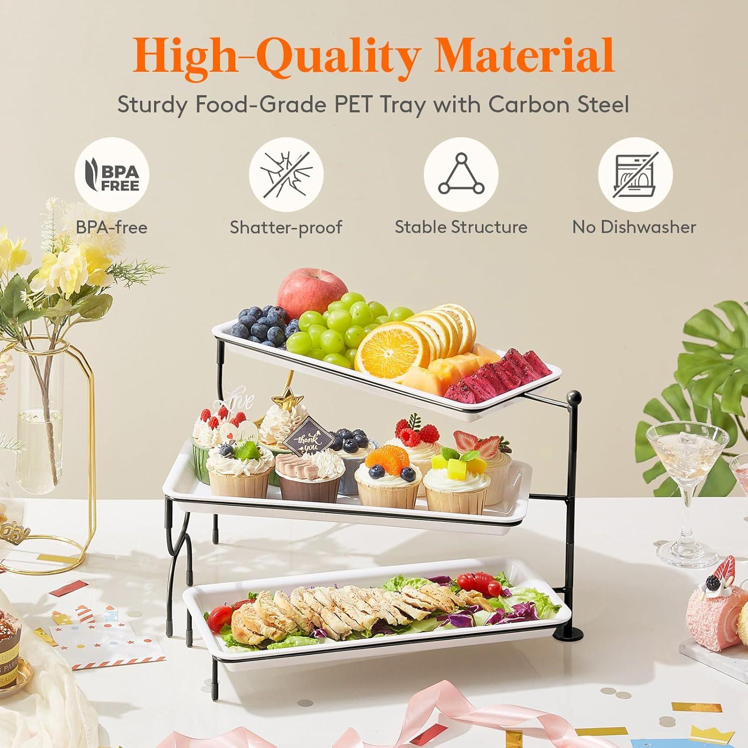 Save Space: The 3 tiered serving tray features a 3-tier design that maximizes vertical space, adding elevation to your food display. It efficiently utilizes limited table space while presenting the food in an organized and appealing manner. When not in use, the trays can be stacked for easy storage.