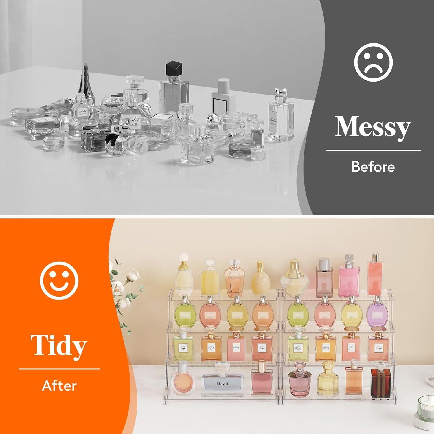 Perfume Organizer Choice: This 4-tier perfume stand with decorative fences effortlessly organizes and showcases your perfumes, elevating the aesthetics of your vanity while utilizing your dressing table space and making them easily accessible