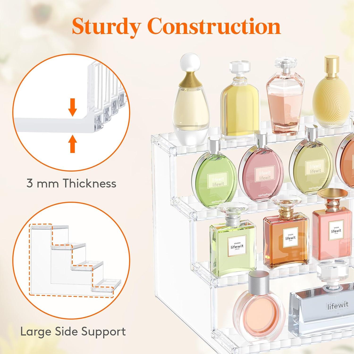 Versatile Storage: This perfume display can accommodate a variety of items such as cosmetics, skincare products, sunglasses, nail polish, and even collectibles; It adapts to your diverse storage needs, making it a versatile addition to your vanity