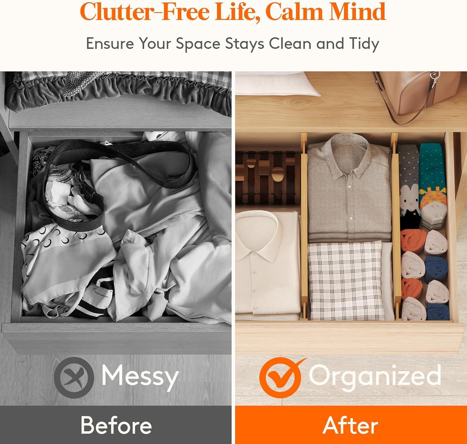 Simple Installation: The expandable dresser separators come with built-in springs for secure and stable placement; They can be easily adjusted in length to meet your specific needs; The minimalist and natural design enhances the aesthetic of most drawers