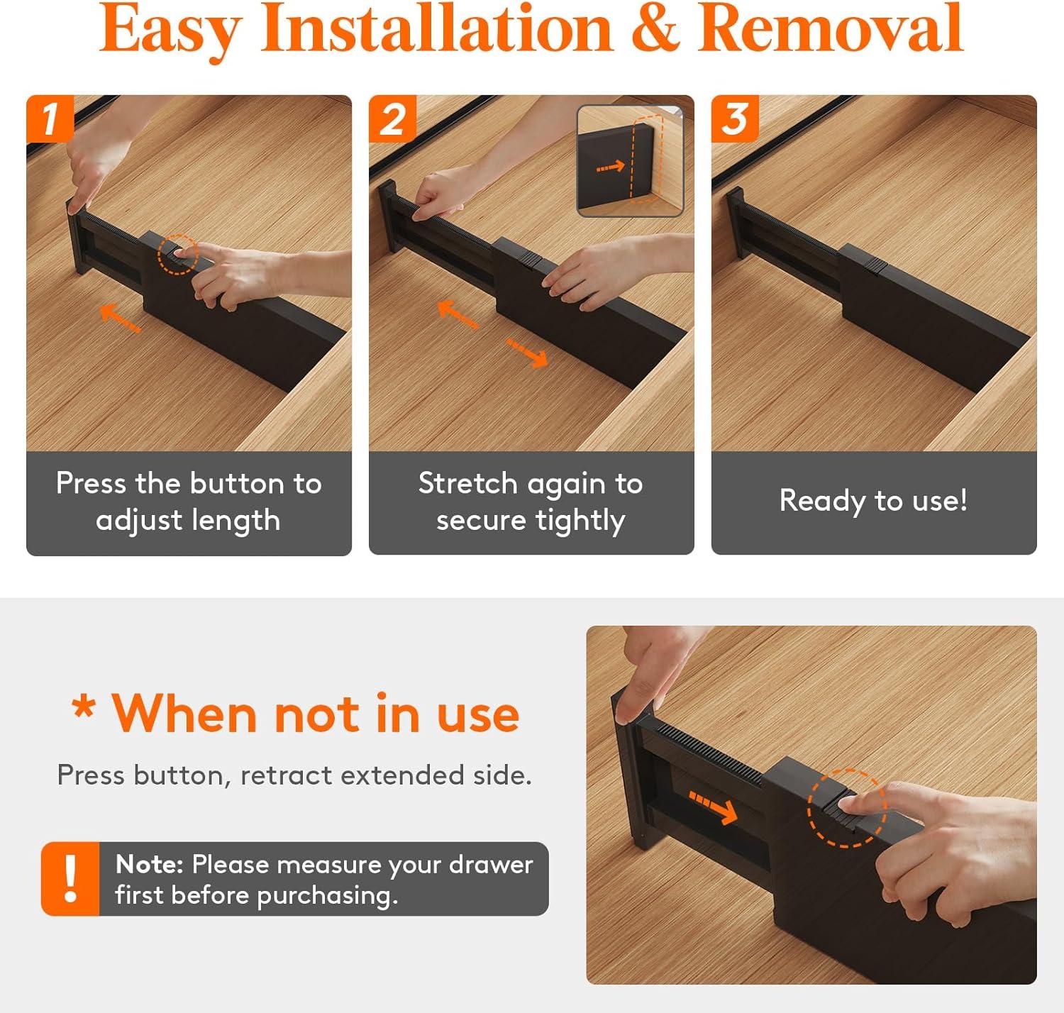 Easy to Install: To adjust the length, press the top button before placing the drawer organizer, and then stretch it out again to secure it tightly. The strong spring tension keeps each organizer upright and secure. When retracting, press the top button and push in the stretched side.