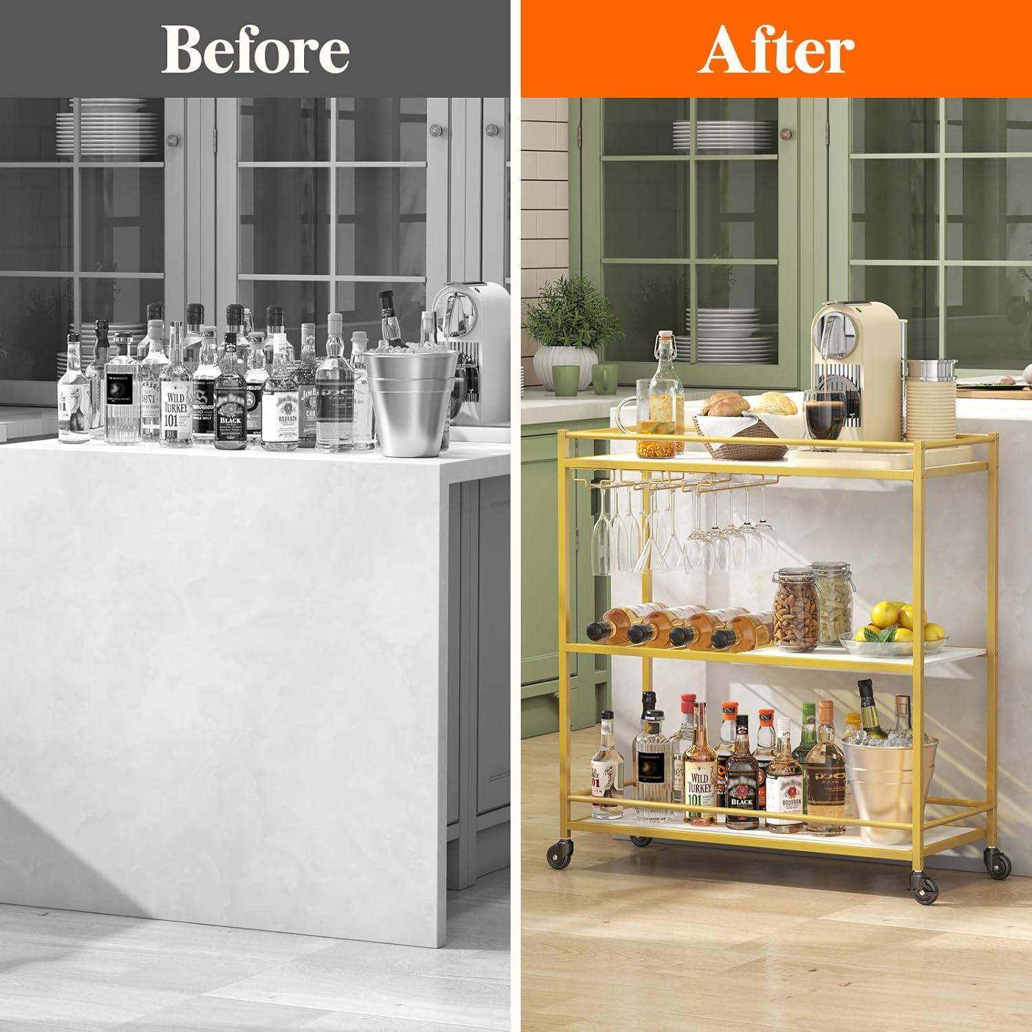 Spacious Storage: With 3 rows of glassware racks for 9-12 glasses and a wine bottle rack for 4 bottles of any shape, this 3-tier bar cart with wheels offers ample space for your beverages and snacks, such as whiskey, gin, rum, and more. Display your favorite drinks conveniently in any room. Assembled size: 31.6″ x 13.1″ x 33.9″ (80.2 x 33.2 x 86 cm).