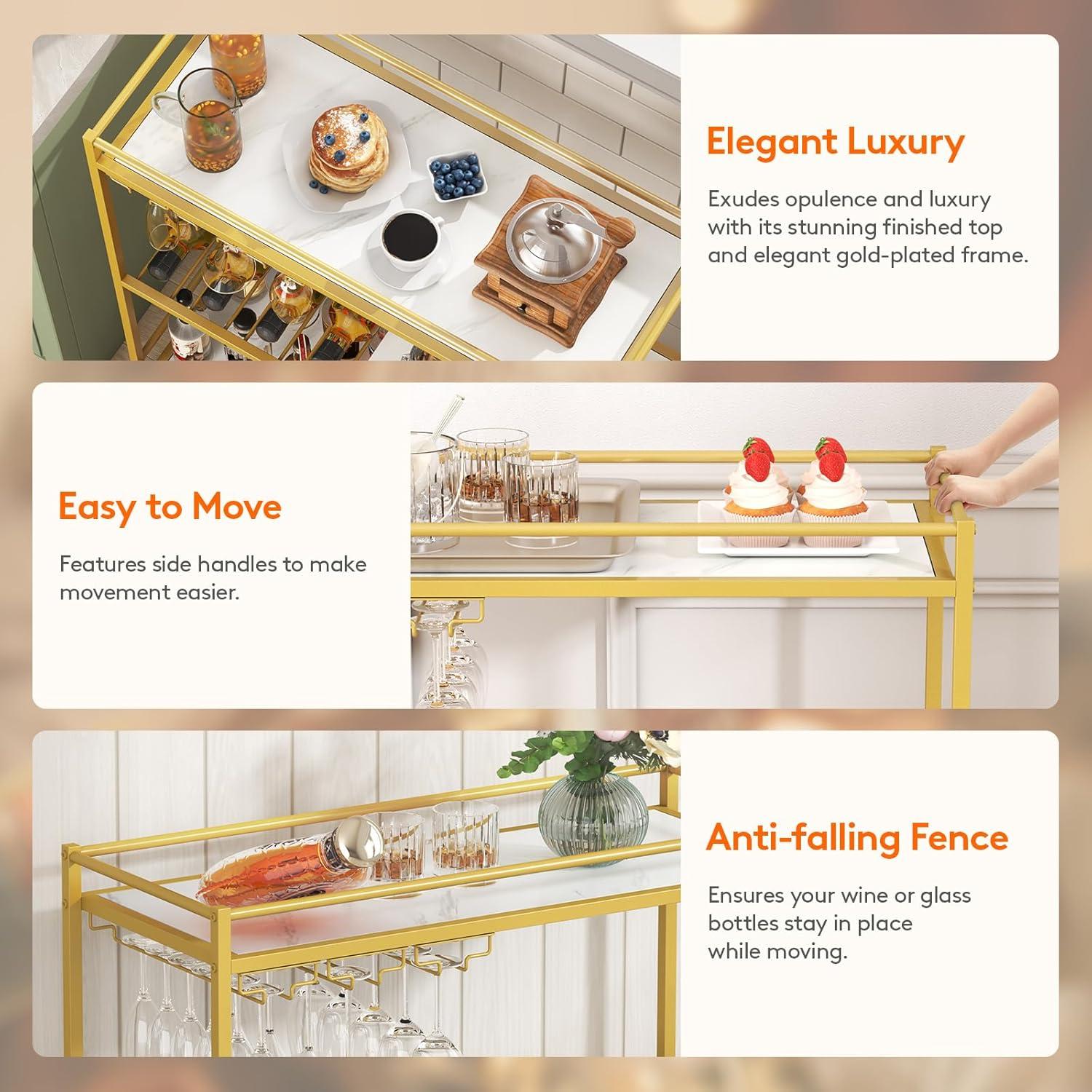 Light Luxury Design: This golden rolling bar cart with wine rack combines fashionable party-style with a touch of luxury. Its stunning finished top and elegant gold-plated frame exude opulence. Perfect for everyday use or special occasions, it adds a touch of glamour to any space.