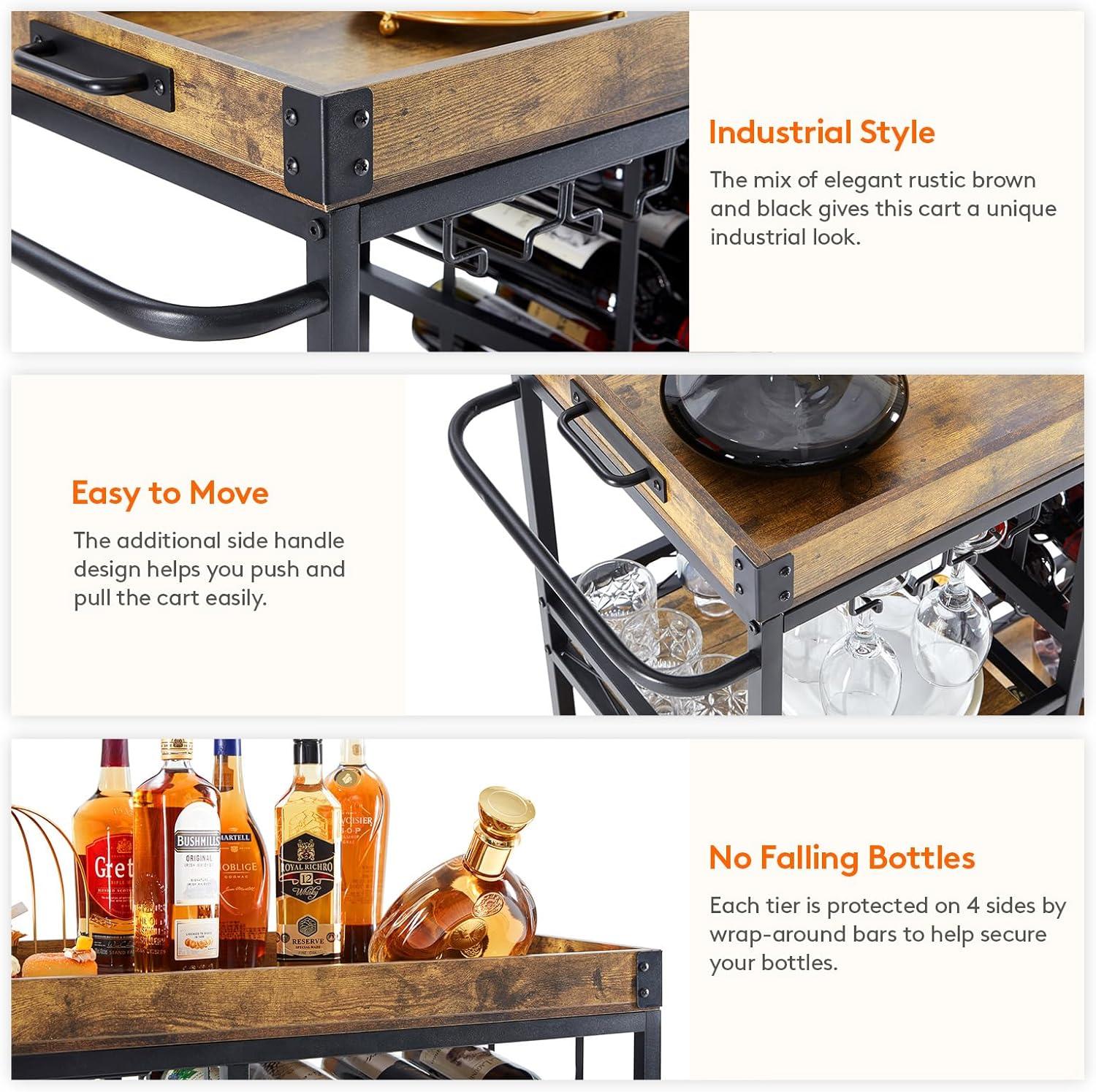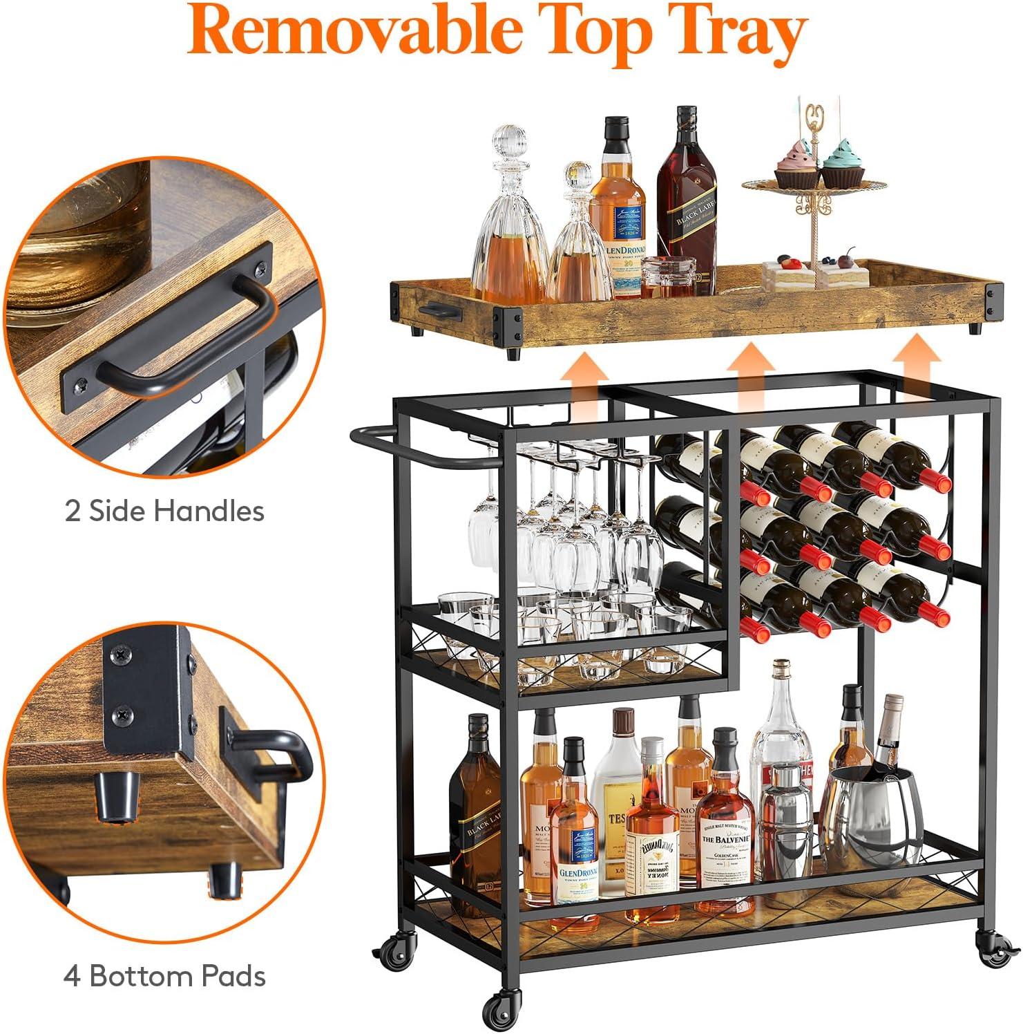 Lifewit Bar Cart, Home Bar Serving Cart, 3 Tier Drink Cart with 12 Wine Bottle Racks, Liquor Beverage Cart for Kitchen Dining Livingroom, 31.5″ x 15.7″ x 36.6″, Removable Top Tray, Rustic Brown