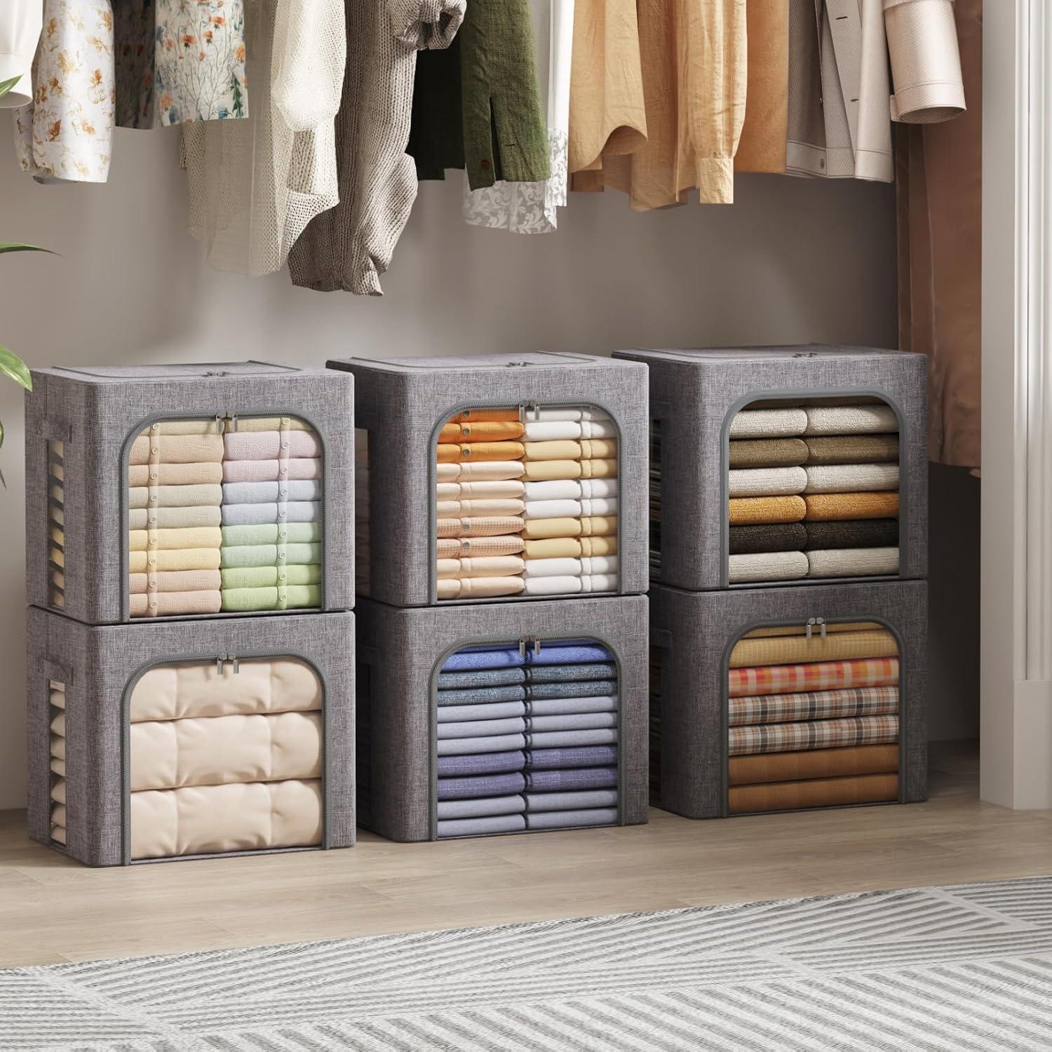 Lifewit Clothes Storage Bins with Metal Frame, Stackable Storage Box, Foldable Clothing Storage Bins with Lids, 40L Storage Bags Fabric Box Organizer with Clear Window& Zippers& Sturdy Handles 4 Pack(6)