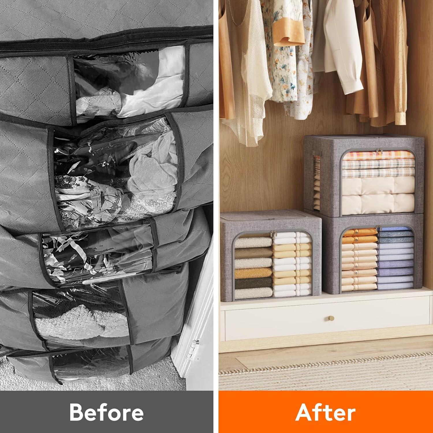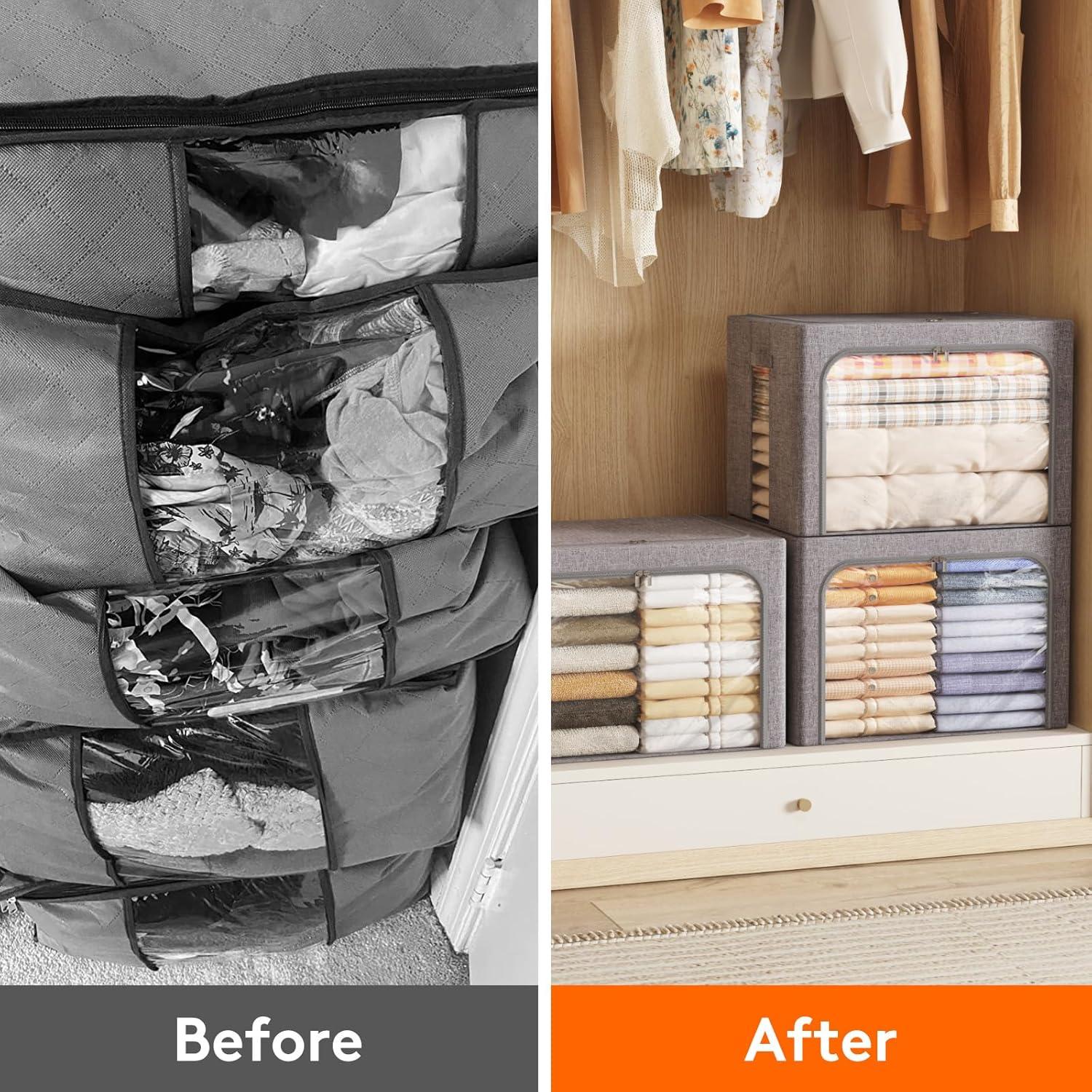 Stay Upright with Easy Installation: This storage box is simple to install, just unfold the two steel frames on either side to start using it. The built-in steel frame structure provides excellent stability, preventing any collapse whether the closet organizer is empty or filled with clothes. Multiple storage bins can be stacked freely, allowing for convenient organization. The sturdy fabric ensures that clothes inside remain wrinkle-free.