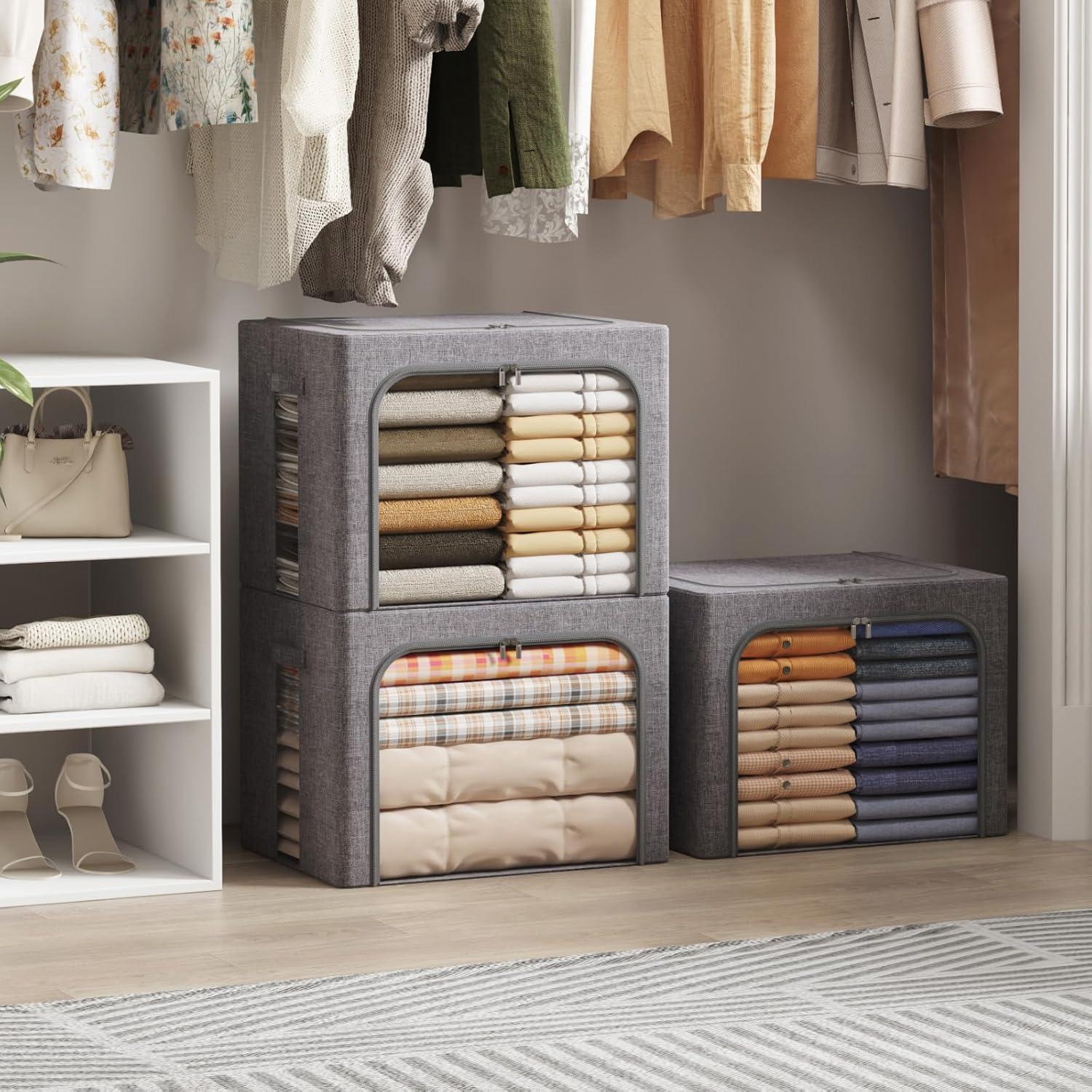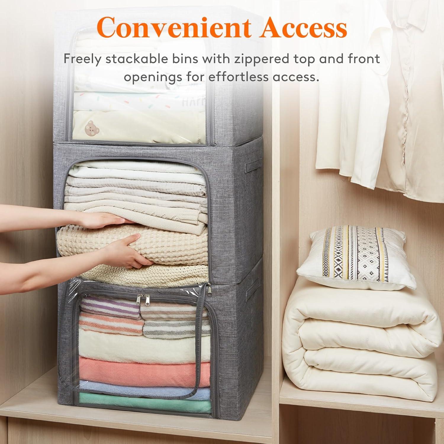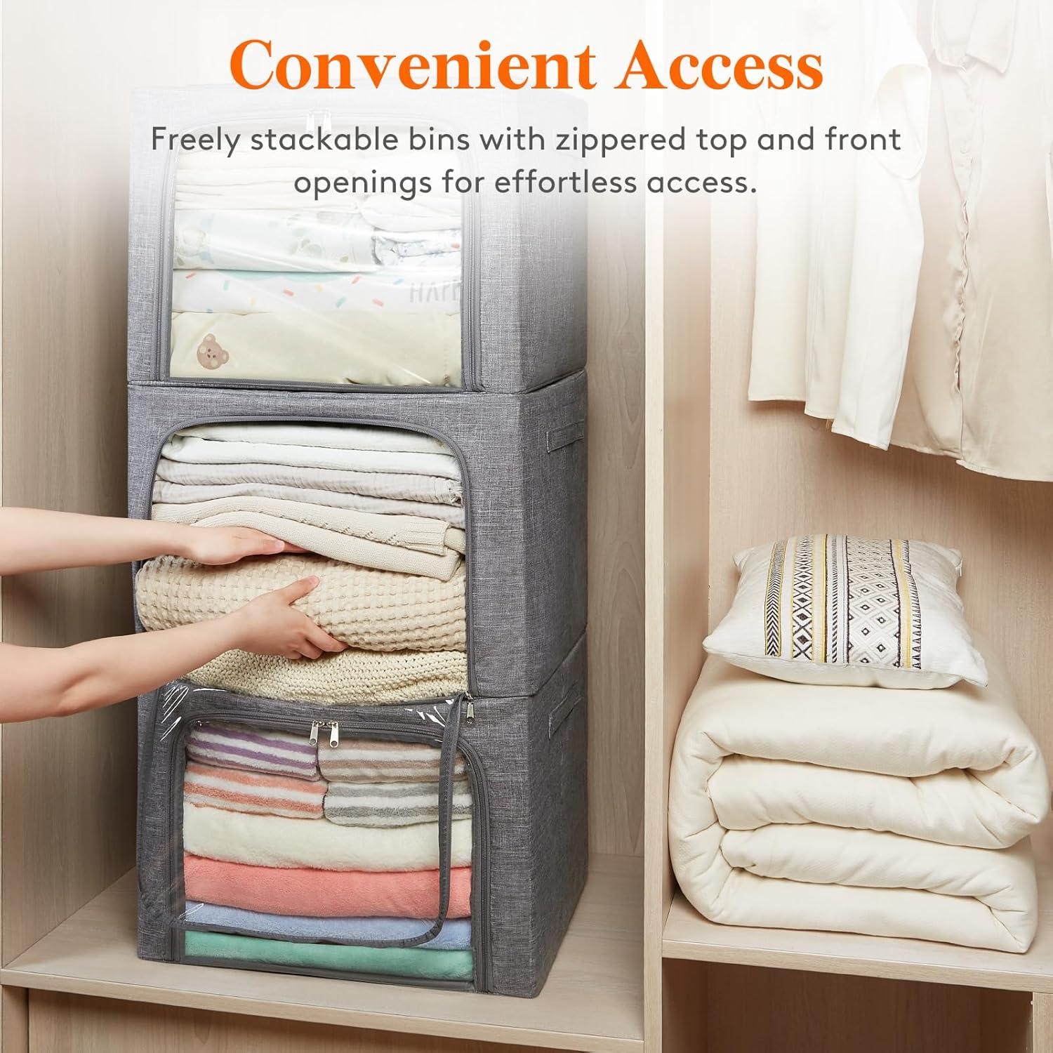 Lifewit Clothes Storage Bins with Metal Frame, Stackable Storage Box, Foldable Clothing Storage Bins with Lids, 40L Storage Bags Fabric Box Organizer with Clear Window& Zippers& Sturdy Handles 4 Pack(3)