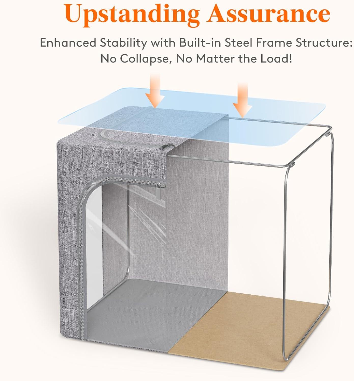 High-Quality Material: Made with high-density cationic fabric, these clothes storage bins offer sturdy support with its sturdy steel frame, and the bottom cardboard provides excellent weight-bearing capacity, while the front and side PVC see-through windows enhance visibility.