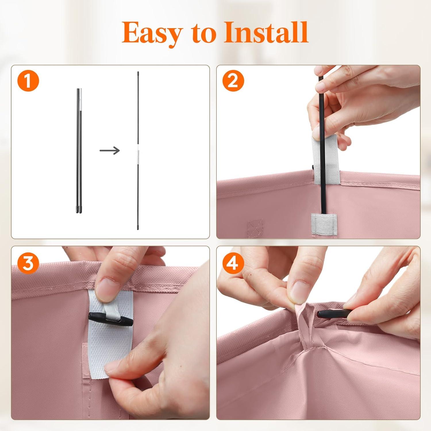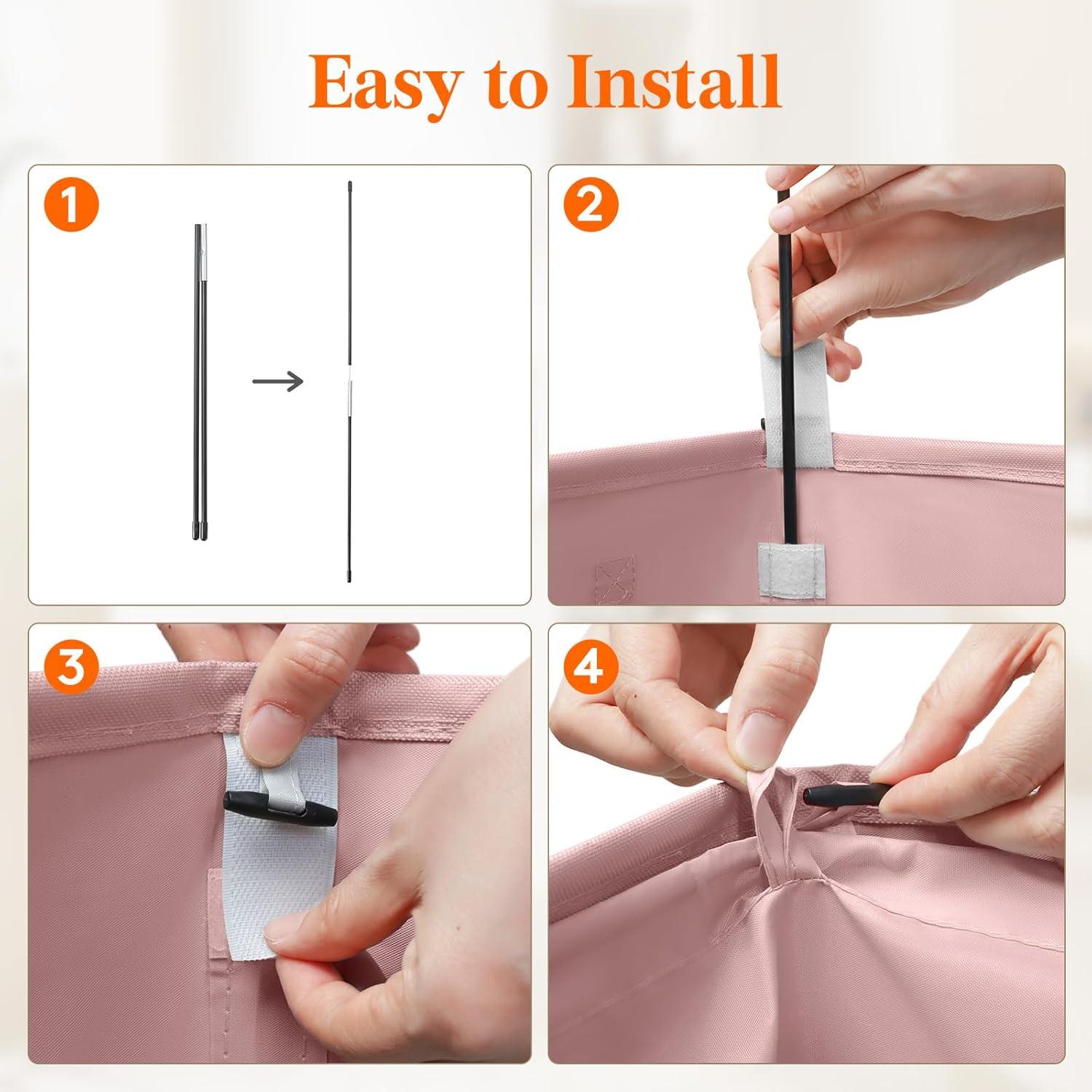 Firm & Stable: Constructed from 300D cationic fabric and 1.2mm adhesive coated EVA foam, this laundry hamper is fitted with 2mm cardboard inserts on top and bottom for structure stability. Along with a steel rod and 6 supporting glass fiber pole rods, this hamper is built solid and firm for use.