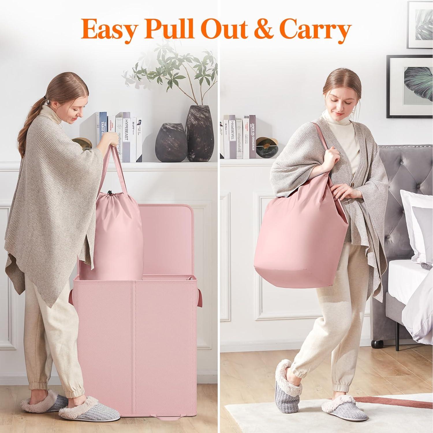Two Large Compartments: With 2 large divided sections, you can easily separate darks and lights, clothing from linens, his and her items, or adult pieces. Two included laundry bags with handles fits onto the hamper firm and tight with drawstring stoppers. Use the handles to easily pull out the removable laundry bags with dirty laundry for wash.