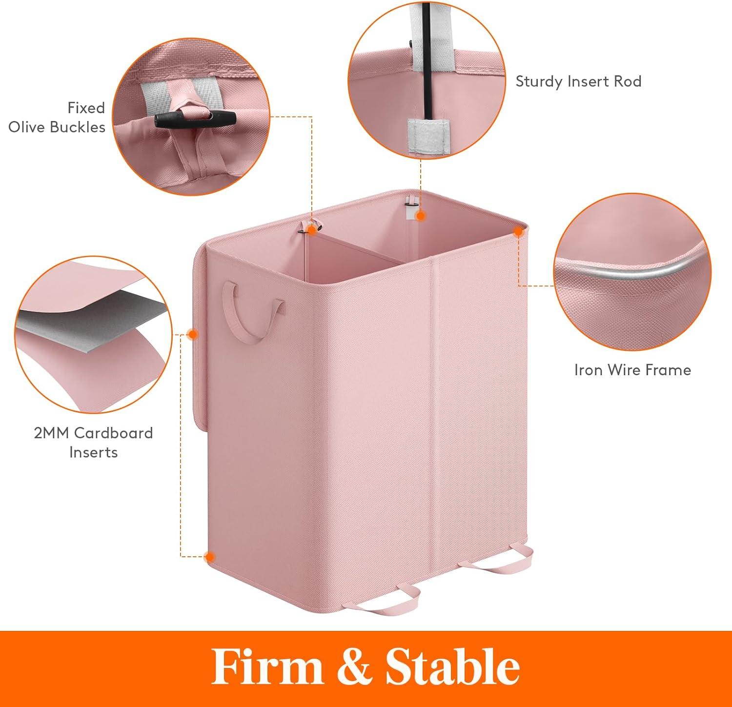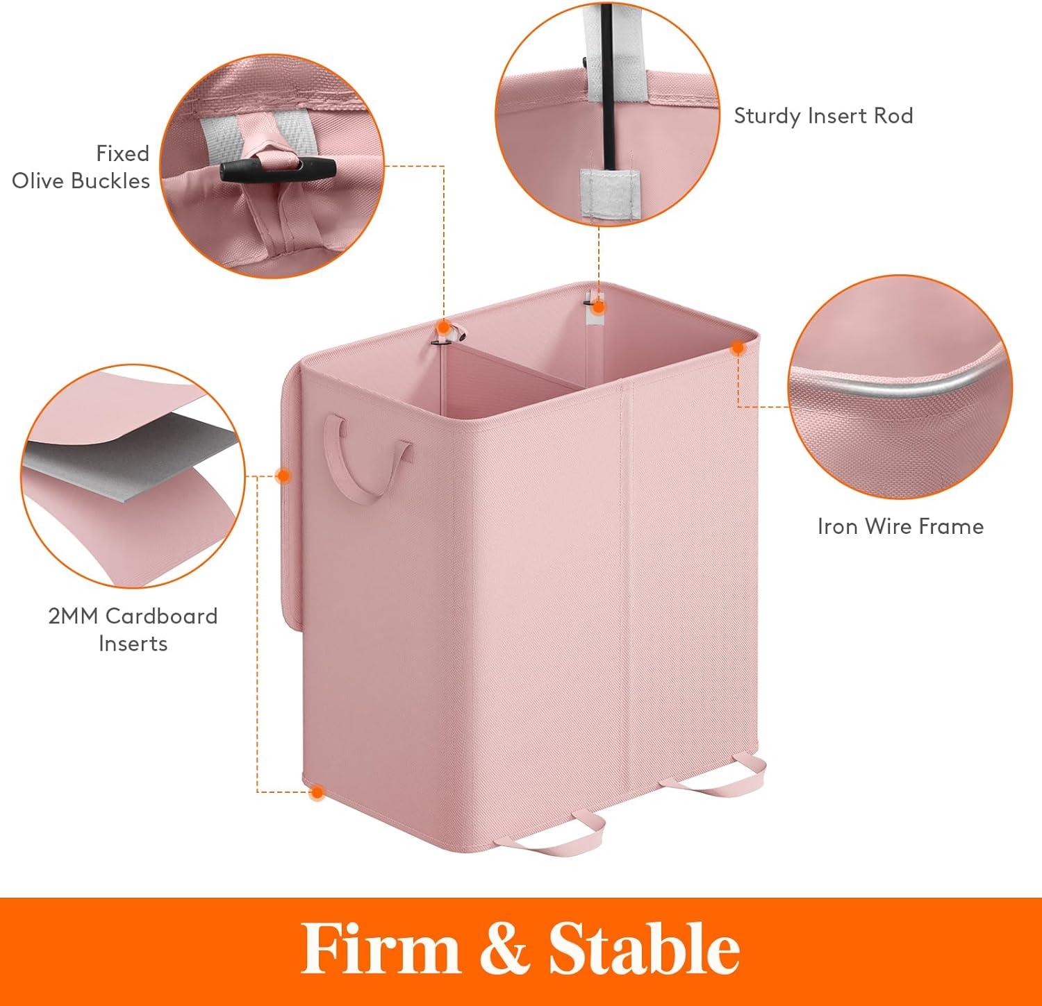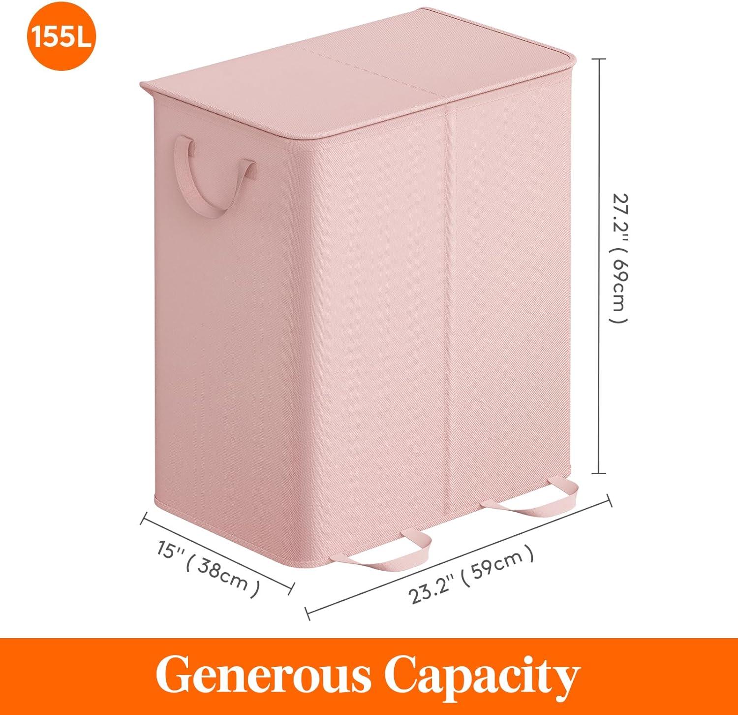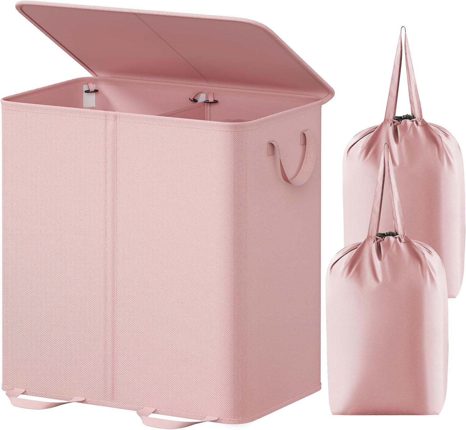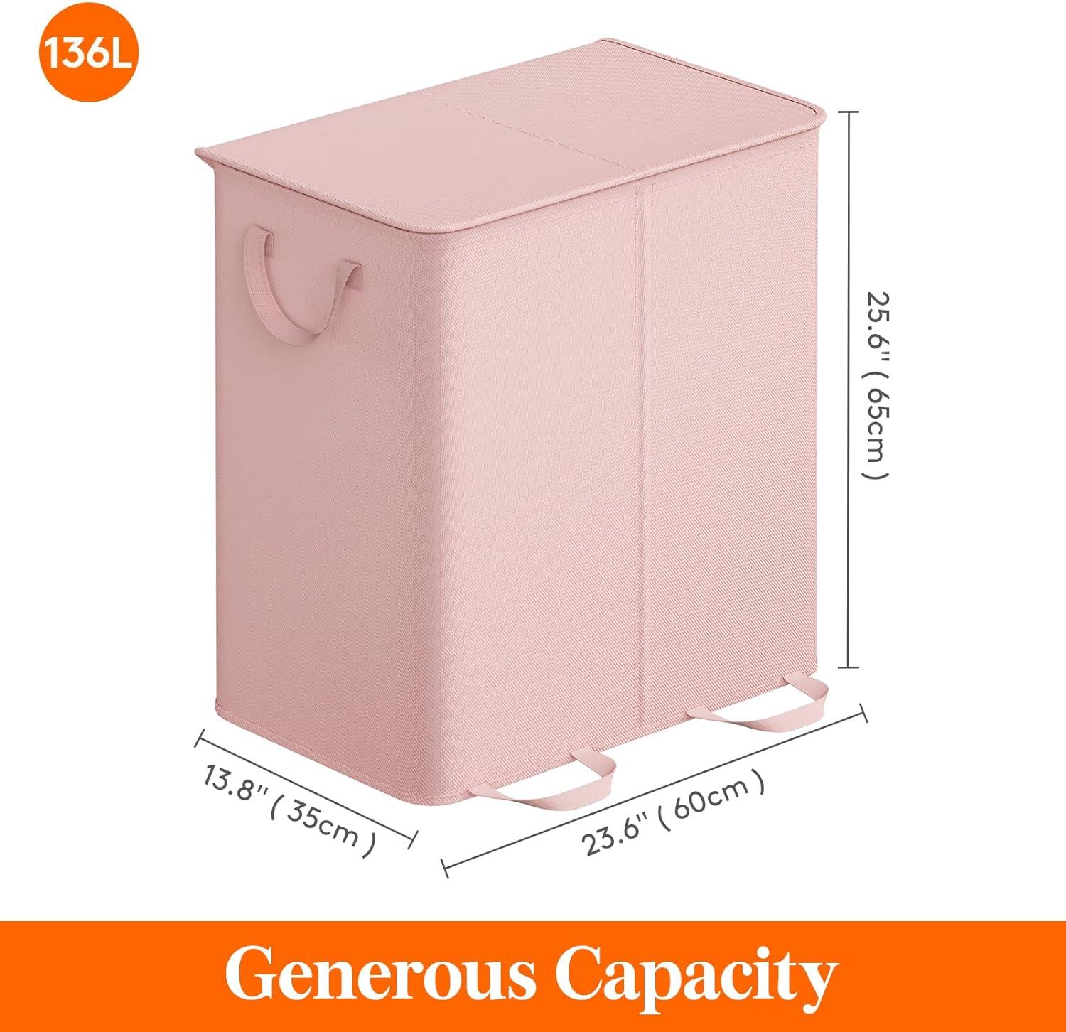 Lifewit Double Laundry Hamper with Lid and Removable Laundry Bags, Large Collapsible 2 Dividers Dirty Clothes Basket with Handles for Bedroom, Laundry Room, Closet, Bathroom, College, 136L Gray(Pink)