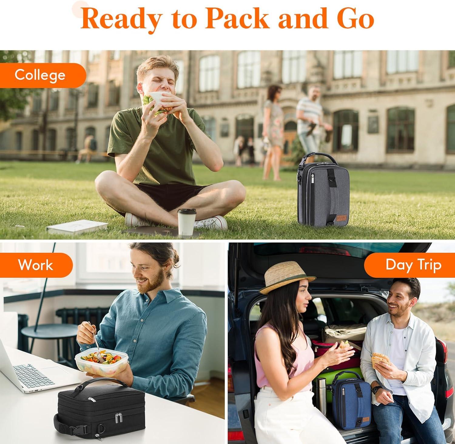 5 Ways to Carry: The lunch bag can be carried horizontally or vertically using its dual padded handles or adjustable shoulder strap. The side handle is equipped with a quick-release buckle, allowing for hands-free carrying when attached to backpacks. Perfect for work, picnics, camping, and everyday use.