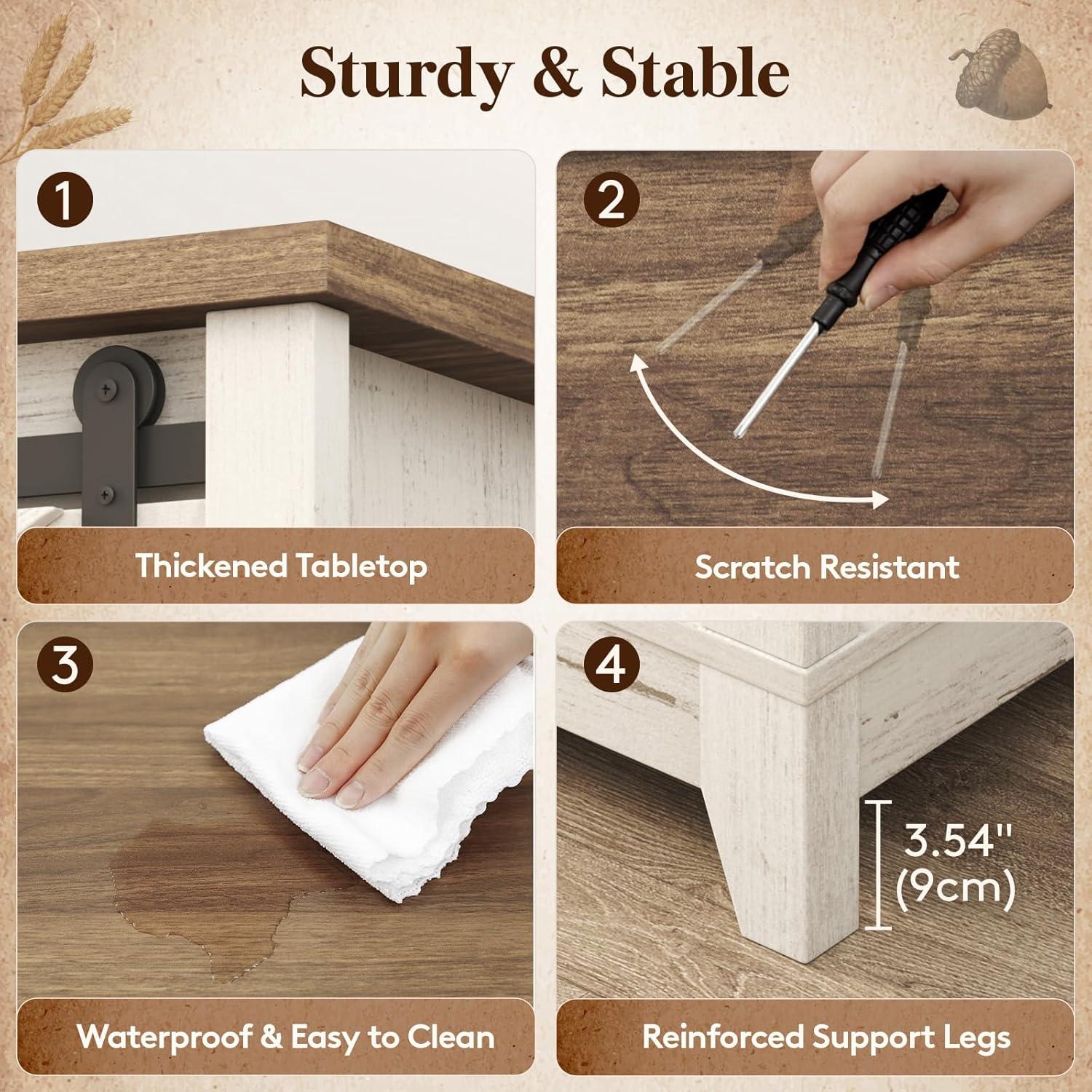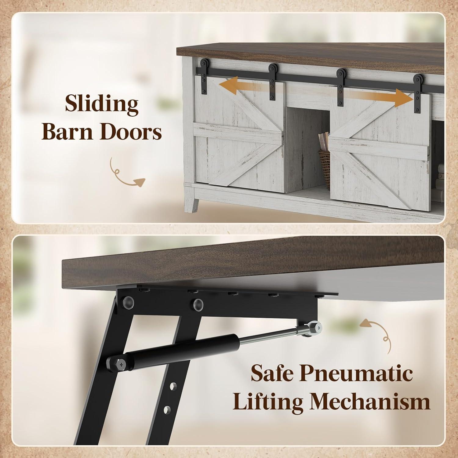 Lifewit Farmhouse Double Lift Top Coffee Table with Sliding Barn Doors, Wood Square Center Table with Large Hidden Storage Space and Open Cabinet, for Living Room, Bedroom, Home Office, Rustic White