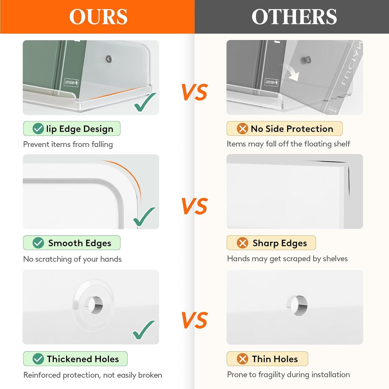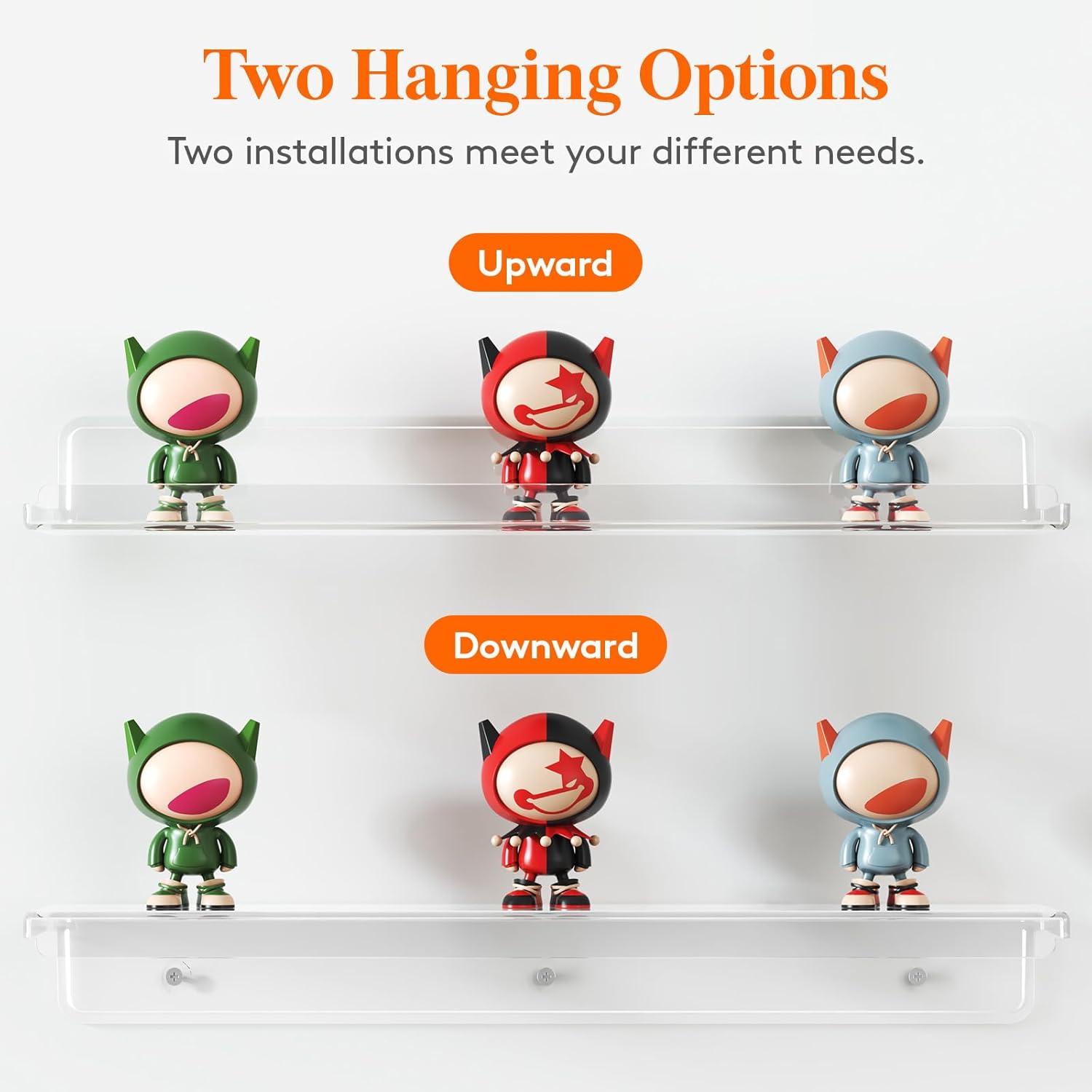 2 Ways to Install: The two hanging options are upward or downward. Acrylic shelves come with pre-drilled holes, detailed instructions, and all necessary mounting hardware, including screws, wall anchors, and bubble lever, which make installation simple and easy in just a few minutes.