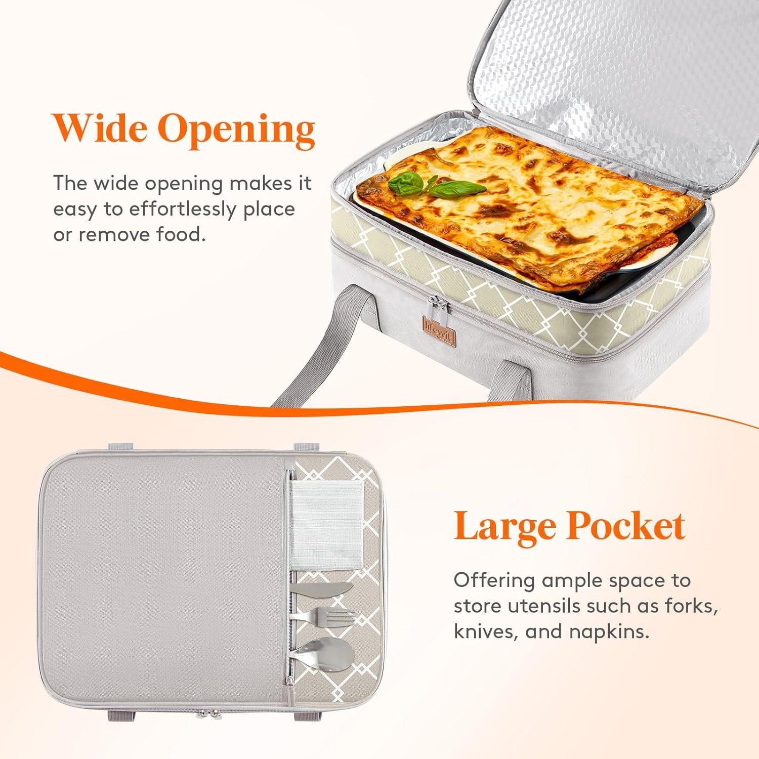 Versatility: With its large capacity and lightweight construction, our hot dish carrier for travel is perfect for storing and transporting food to potluck parties, picnics, tailgates, BBQs, and cookouts
