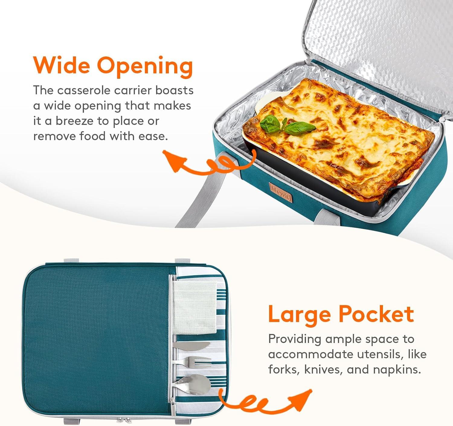 Leakproof: Our casserole dish carrier with lid is crafted from hot-pressed leak-proof aluminum foil, which prevents leaks and spills while perfectly maintaining food temperature. It is also effortlessly easy to clean, making it perfect for on-the-go use
