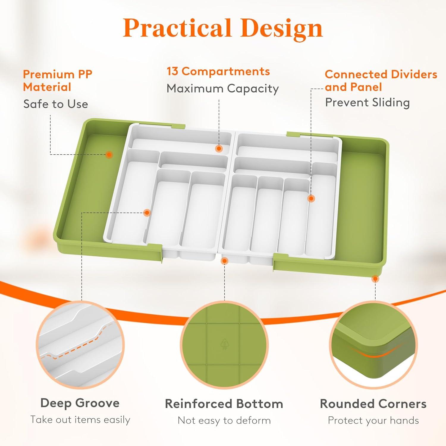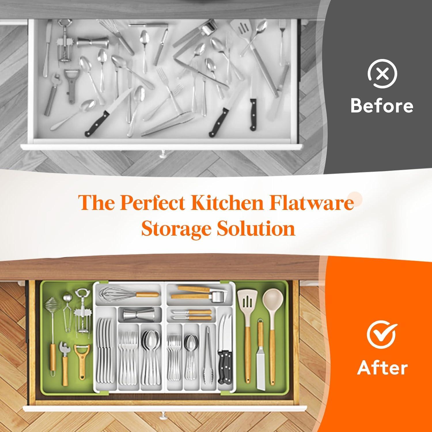 Super Large Capacity: This silverware tray features 11 compartments in the middle and 2 expandable layers. The expandable compartments are great for storing large kitchen utensils, while the middle compartments are perfect for cutlery and small tools. Maximize the storage capacity of your extra-wide kitchen drawers