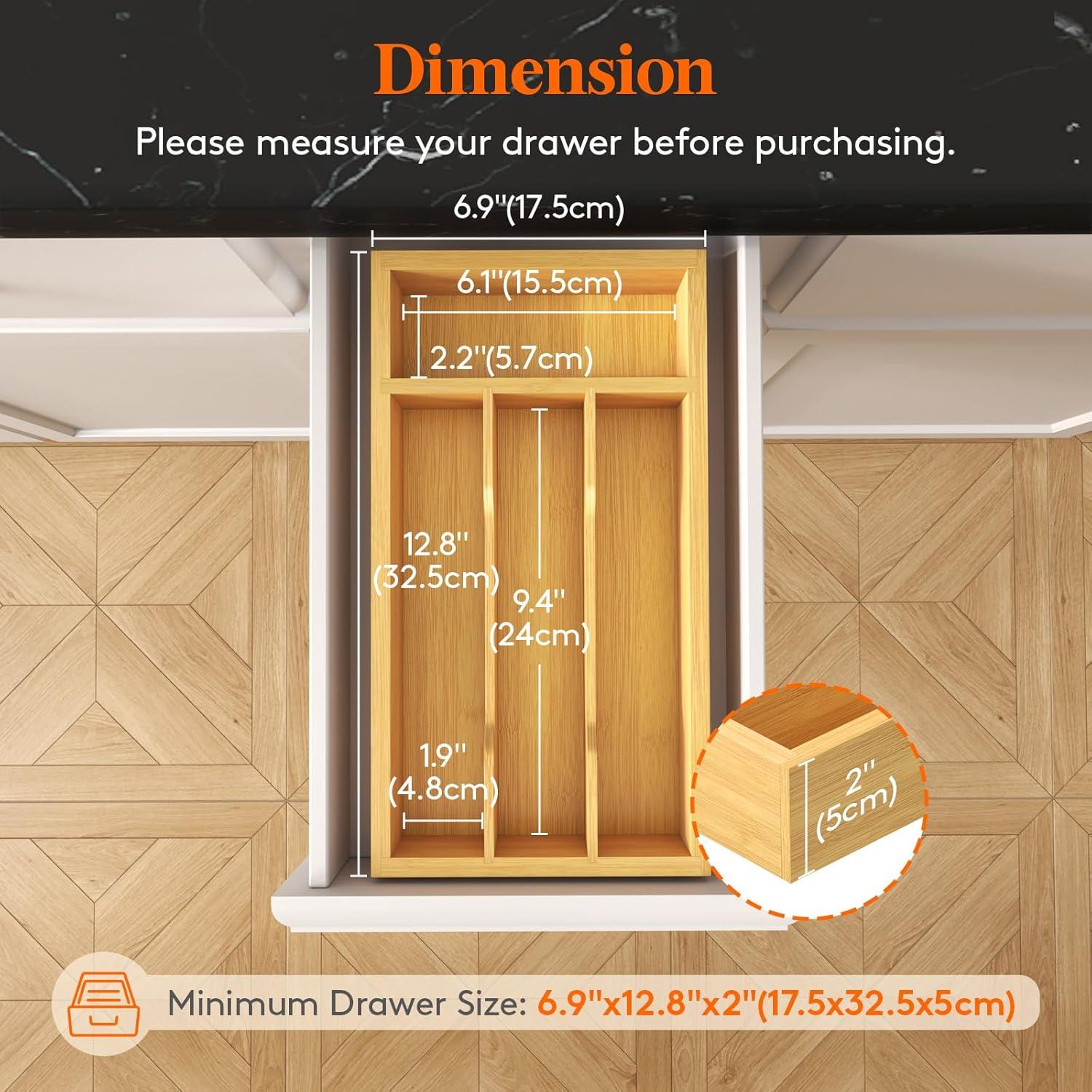 Combinable and Removable Design: The mortise-tenon connection satisfies extra-large drawer storage needs. The silverware organizer for kitchen drawers is assembled with 3 plugs in the middle, offering the flexibility to combine or detach them as separate storage boxes as required