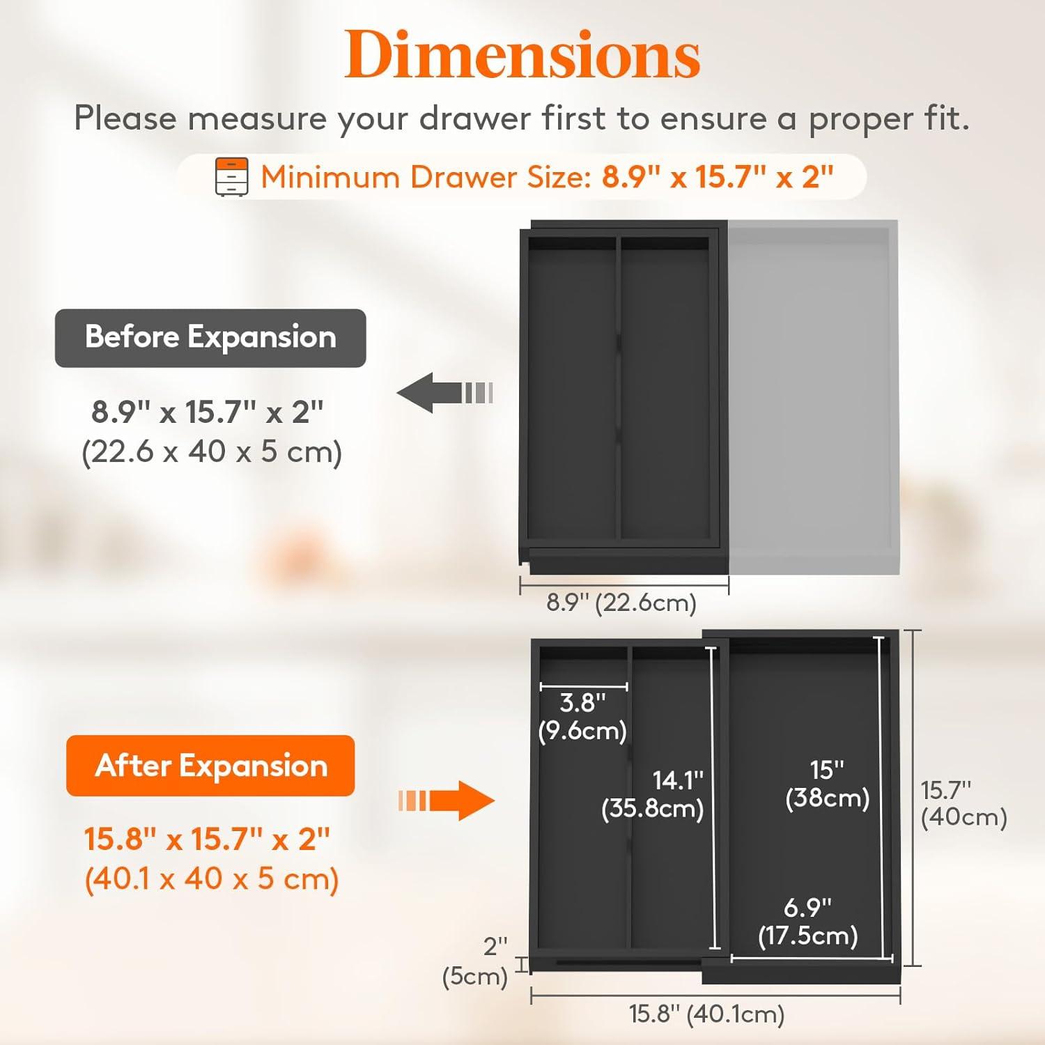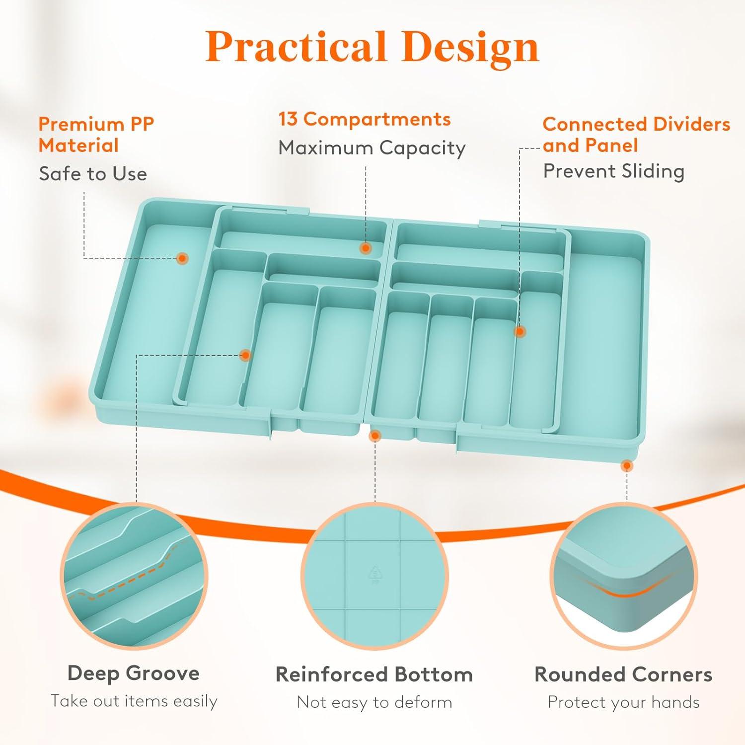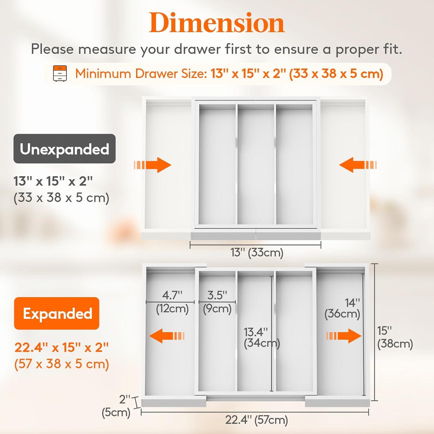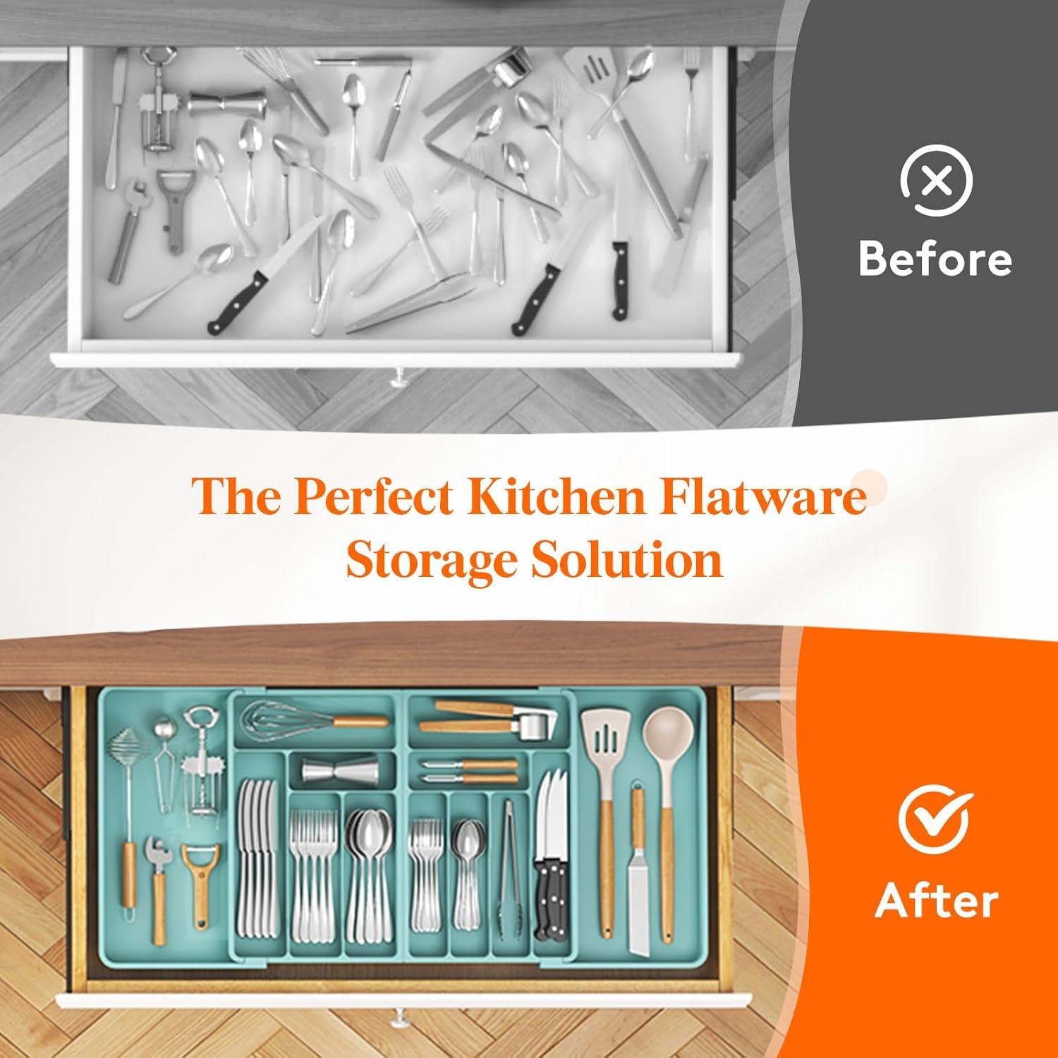 Super Large Capacity: This silverware tray features 11 compartments in the middle and 2 expandable layers. The expandable compartments are great for storing large kitchen utensils, while the middle compartments are perfect for cutlery and small tools. Maximize the storage capacity of your extra-wide kitchen drawers