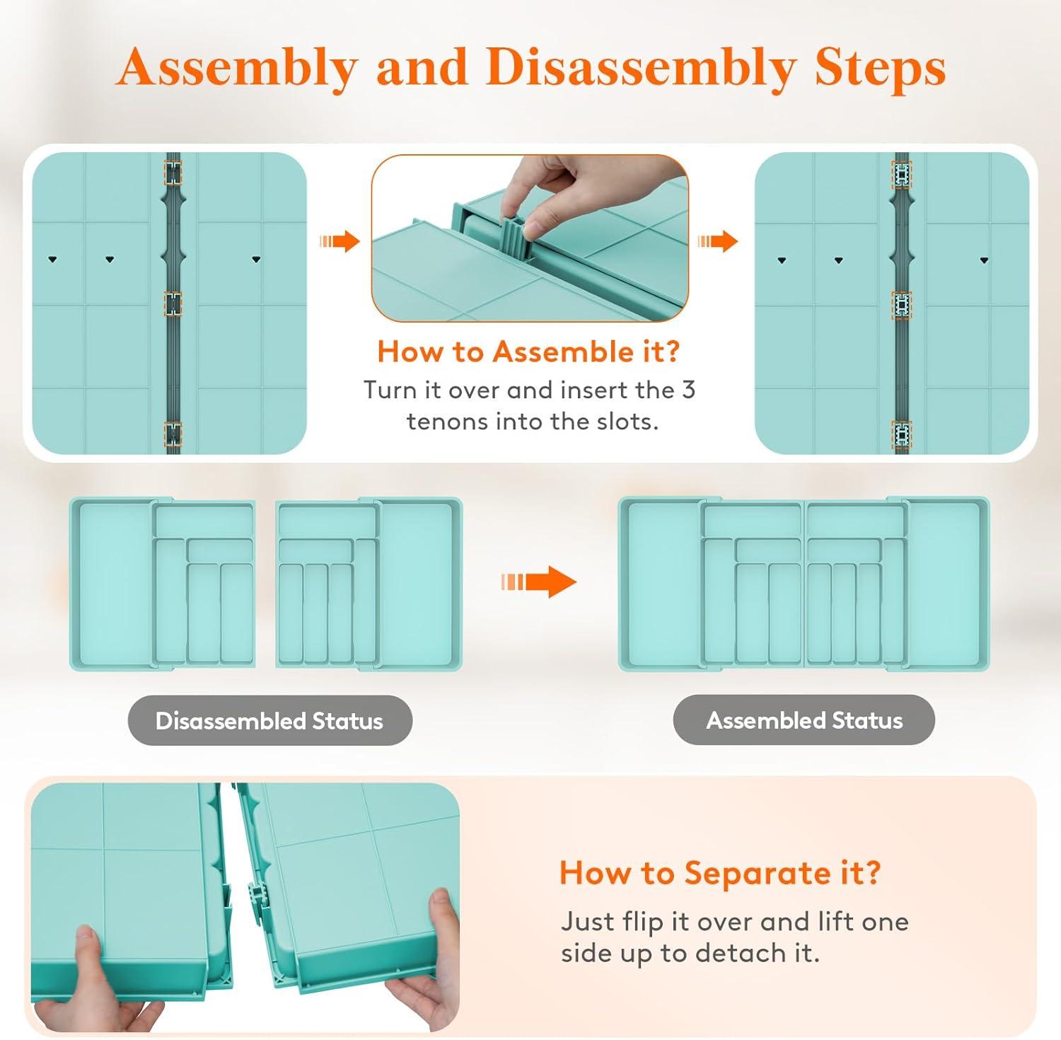 Combinable and Removable Design: The mortise-tenon connection satisfies extra-large drawer storage needs. The silverware organizer for kitchen drawers is assembled with 3 plugs in the middle, offering the flexibility to combine or detach them as separate storage boxes as required