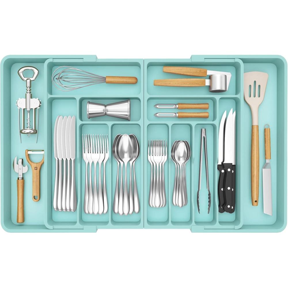 Lifewit Large Silverware Drawer Organizer, Expandable From 21 to 36 Inches, BPA Free Plastic Utensil Tray for Kitchen, Adjustable Flatware and Cutlery Holder for Spoons Forks Knives, Black(Turquoise)