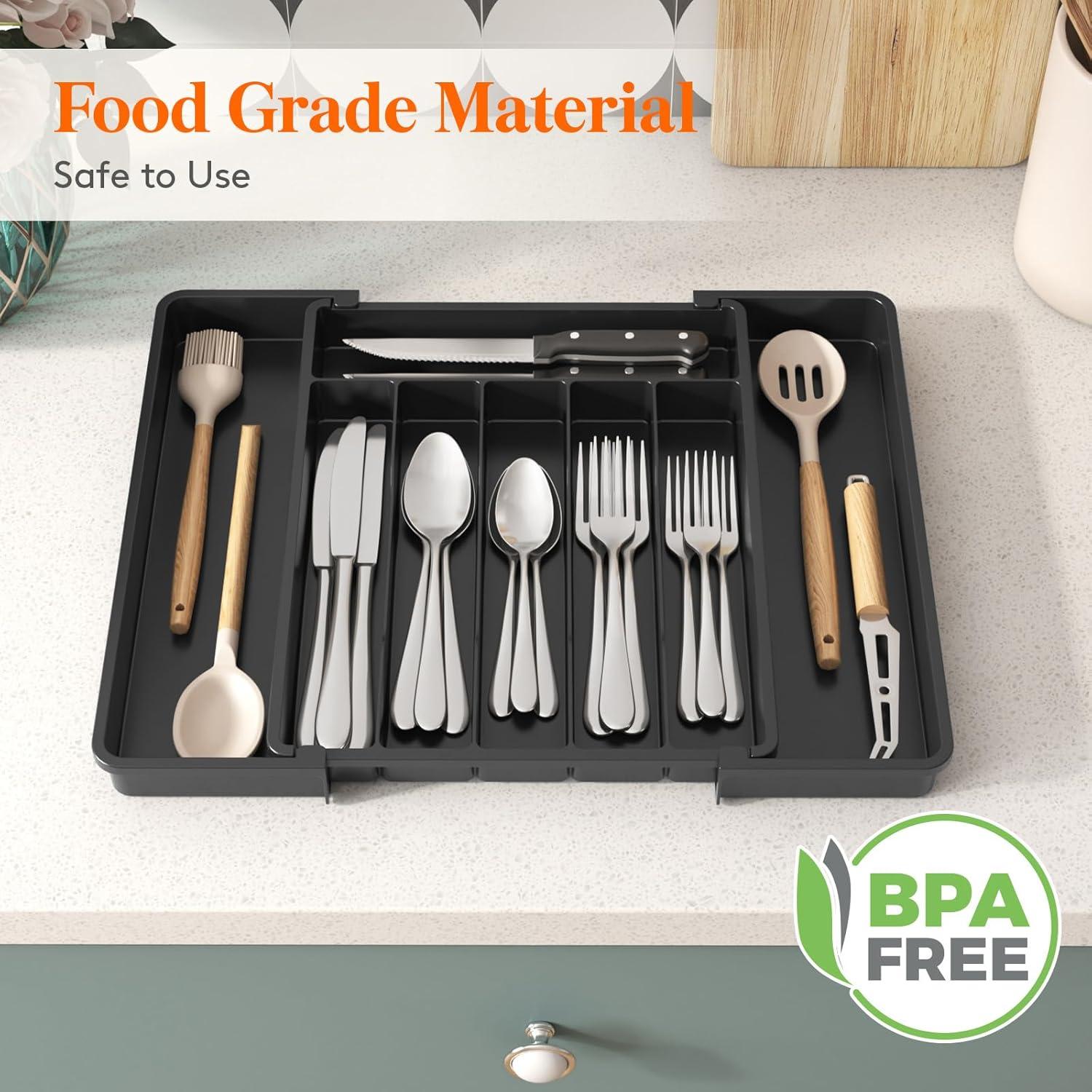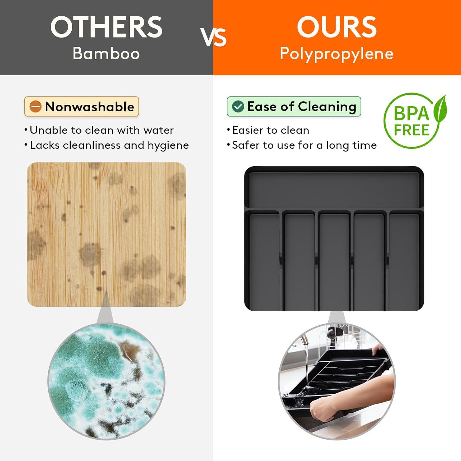 Robust and Safe: This kitchen drawer organizer is crafted from premium PP material, BPA-free and built to last. It ensures your silverware is stored in a healthy, safe environment for worry-free use