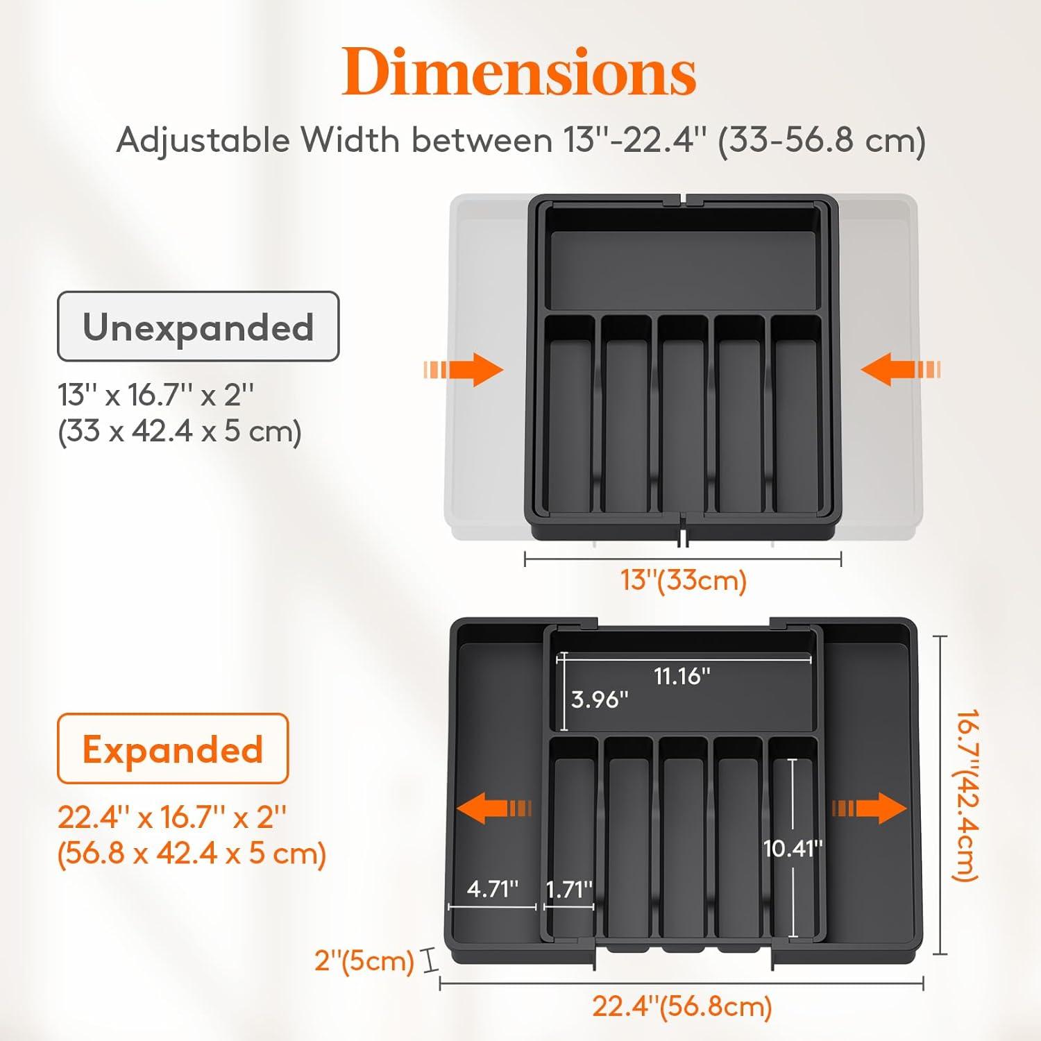 Adjustable Design: With its retractable design, The Lifewit silverware organizer fits drawers of various sizes and shapes. It measures 13'' wide when folded while reaching 22.4'' when fully expanded. This universal utensil drawer organizer helps you maximize storage space efficiently while keeping your utensils neatly organized and easily accessible