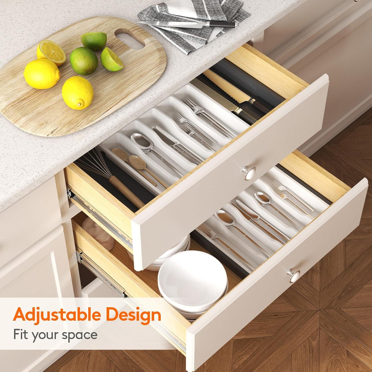 Thoughtful Design: Unique groove design for easy access to cutlery; The buckle design ensures smooth sliding and effortless adjustment, preventing partition displacement. Lifewit utensil holders bring seamless order to your kitchen!