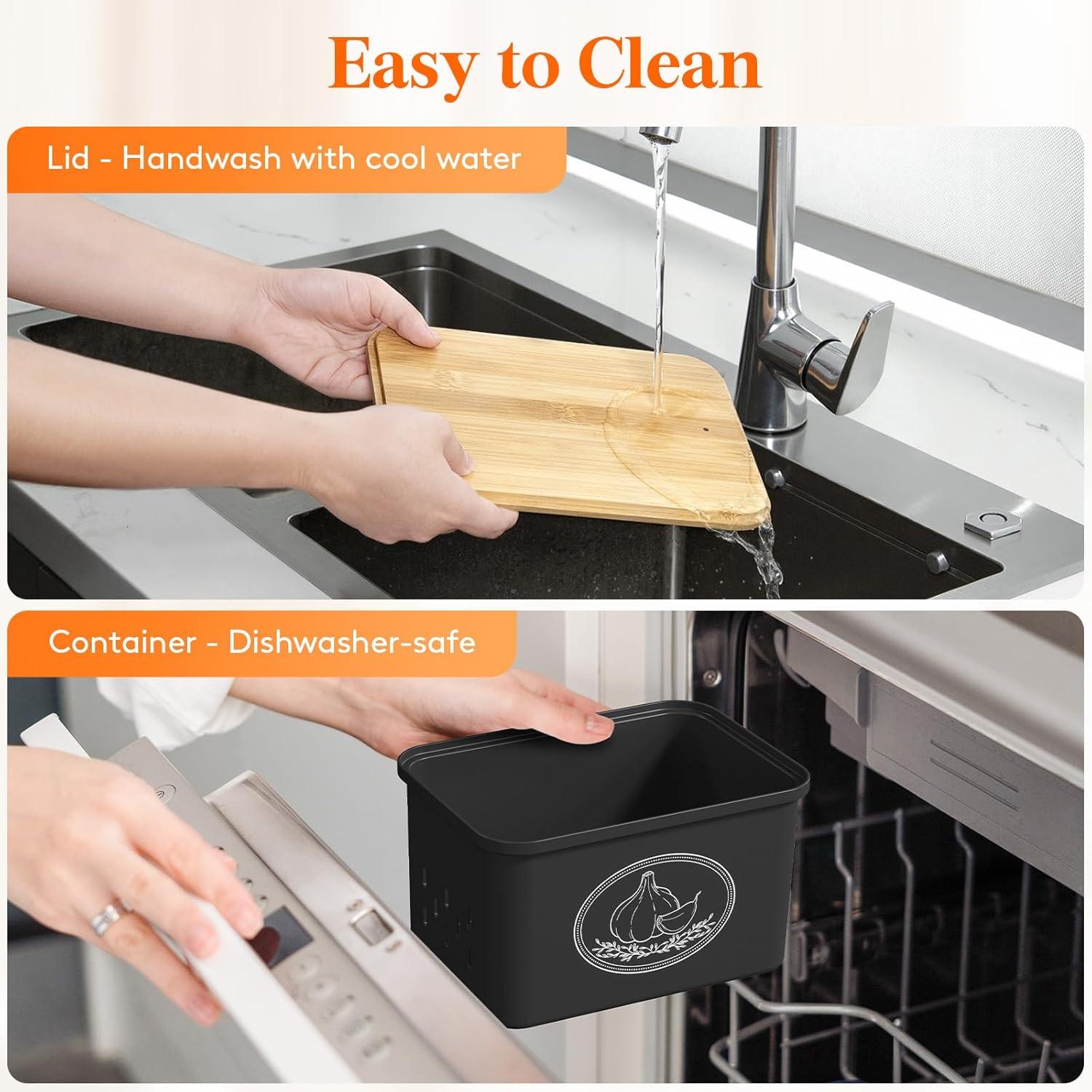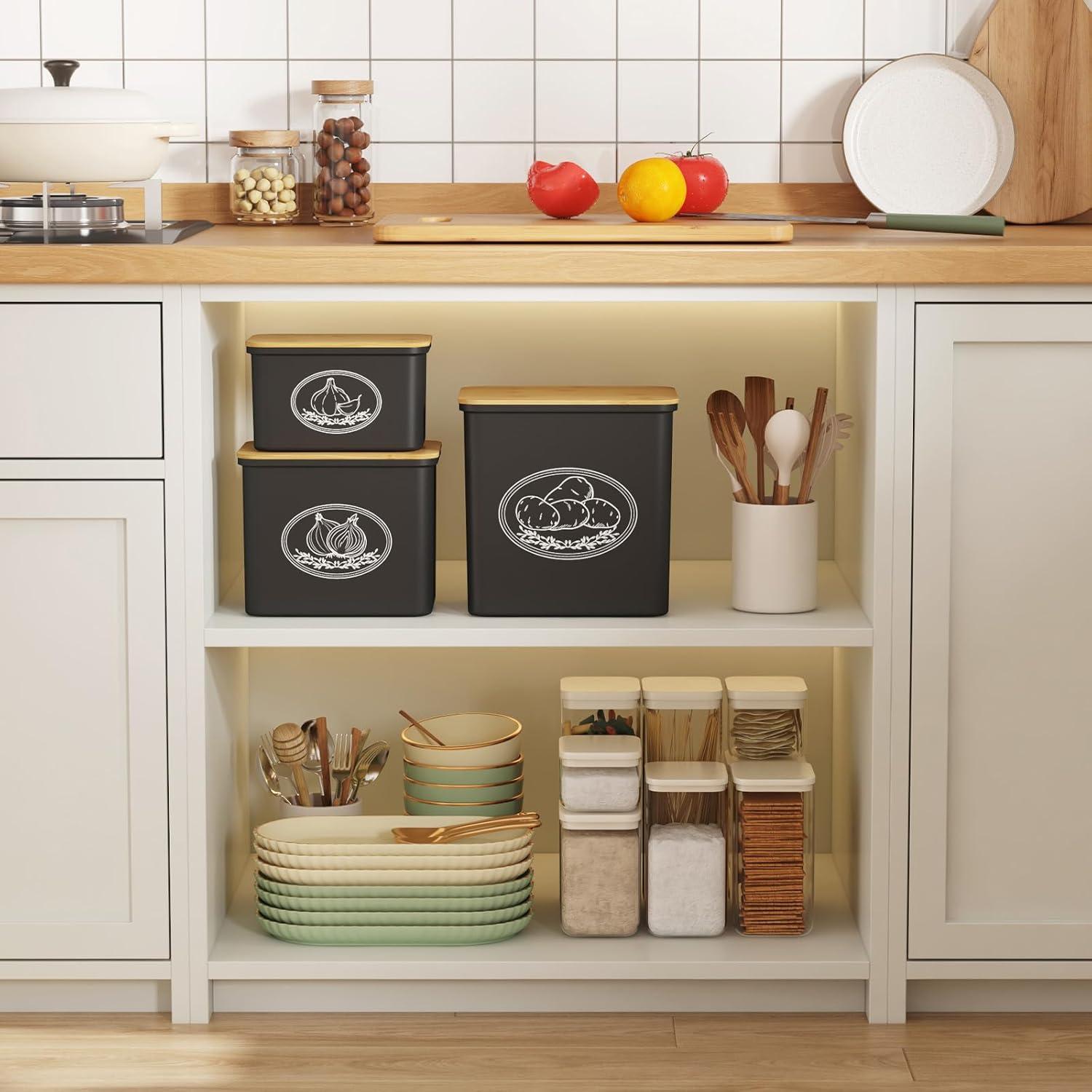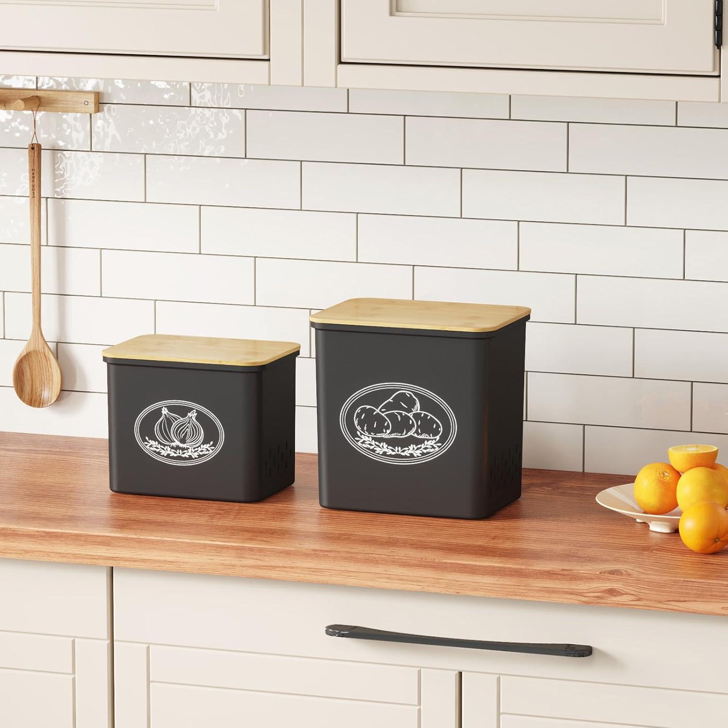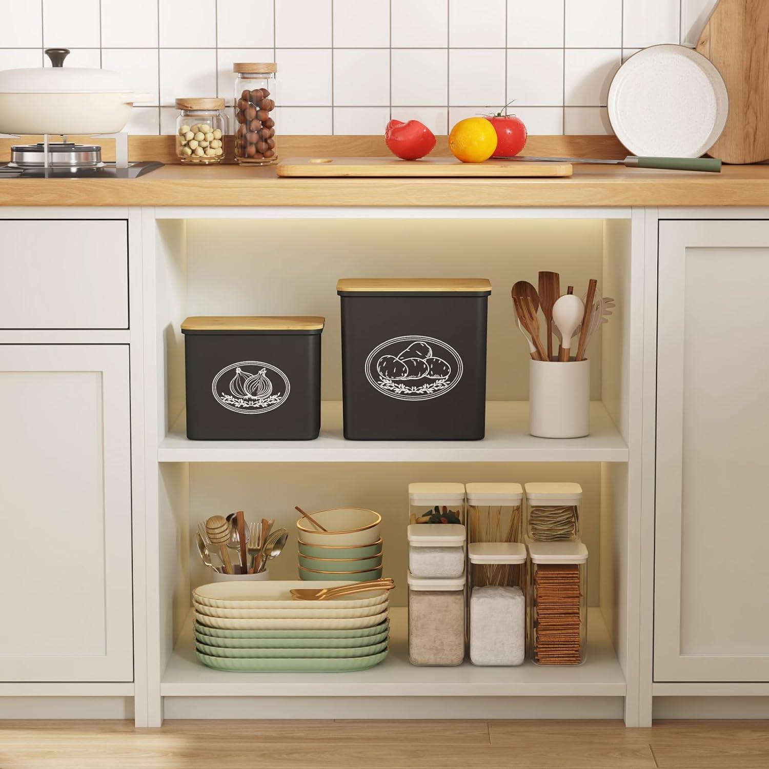 Easy to Clean: These potato and onion storage bins have smooth surface and them easy to clean; you can put them in the dishwasher or wash them by hand in cold water. NOTE: the bamboo lid is NOT dishwasher safe