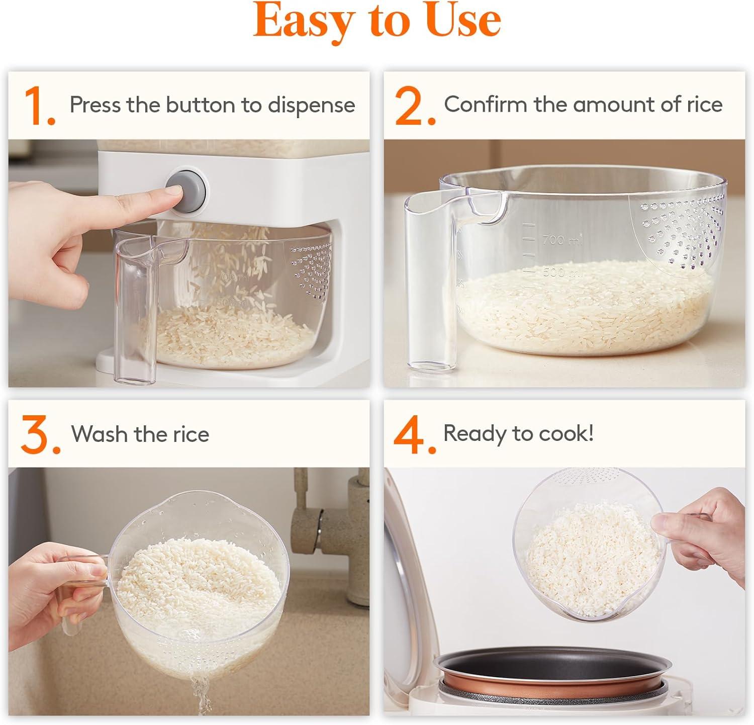 Easy to Use: Just press the button for dispensing the rice, and release the button to stop. Both the rice dispenser and the cup have transparent scales, so you can intuitively understand the remaining amount of rice and the amount of rice to be taken. And it is easy to disassemble to clean it.