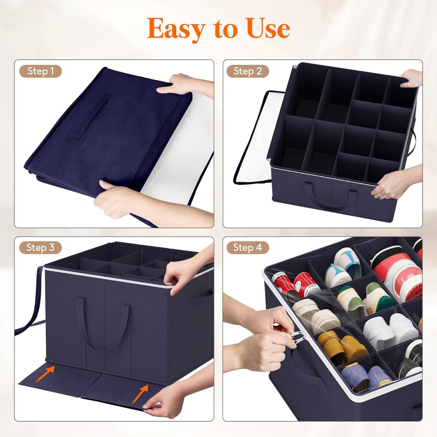 Spacious Capacity: This 17″x17″x12.5″ (43x43x32cm) shoe organizer holds 12-16 pairs. It features 8 small (11x11cm) and 4 large (21x14cm) compartments for all footwear types. Measure the length, width, and height of the room where you plan to place the box