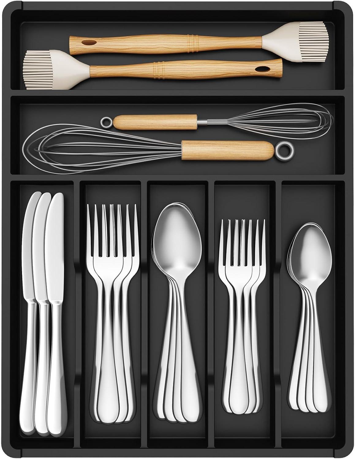 Lifewit Silverware Drawer Organizer Tray, Plastic Cutlery Storage for Kitchen Drawer, Flatware and Utensil Holder Divider for Spoons Forks Knives Tableware, 5 Compartment, Black(Black)
