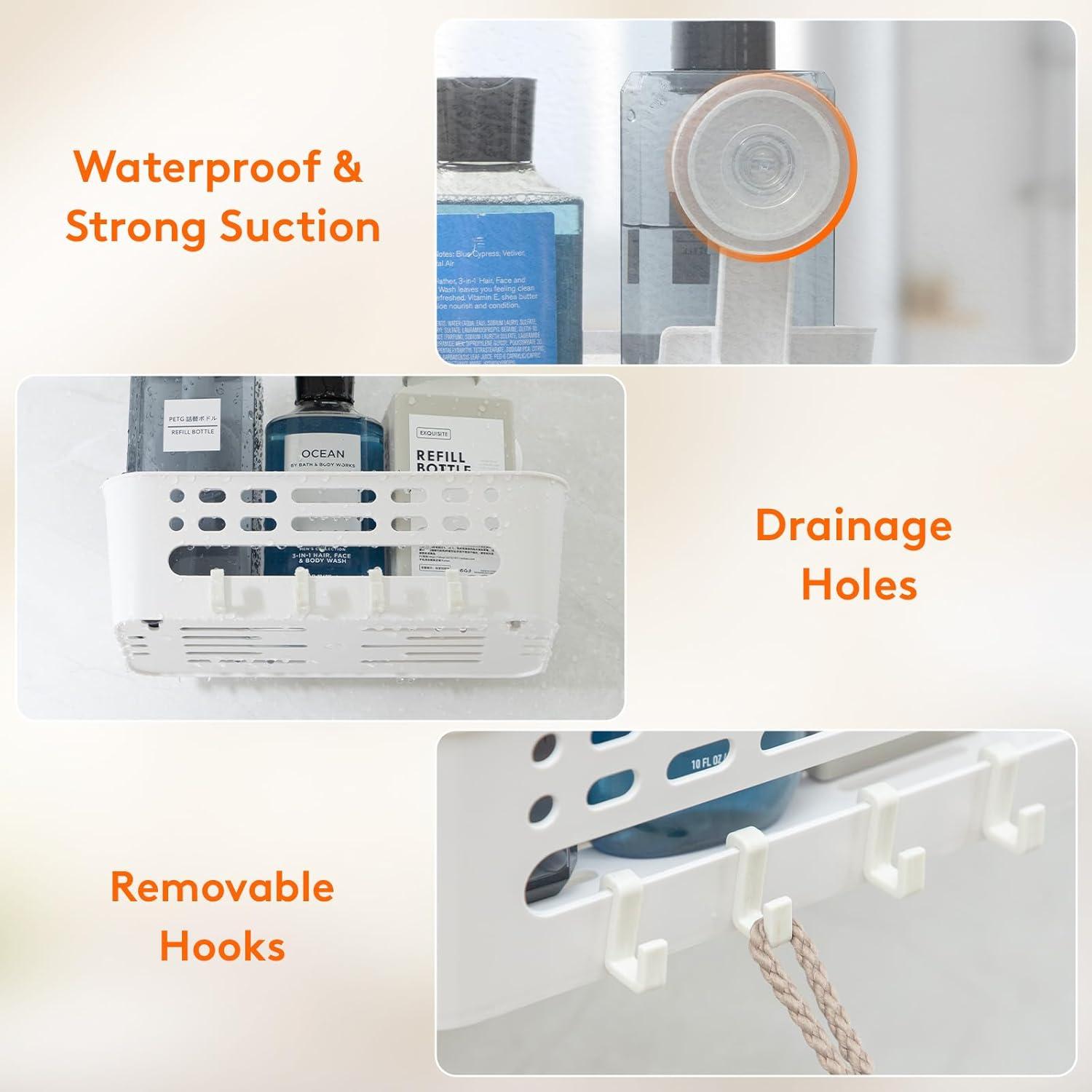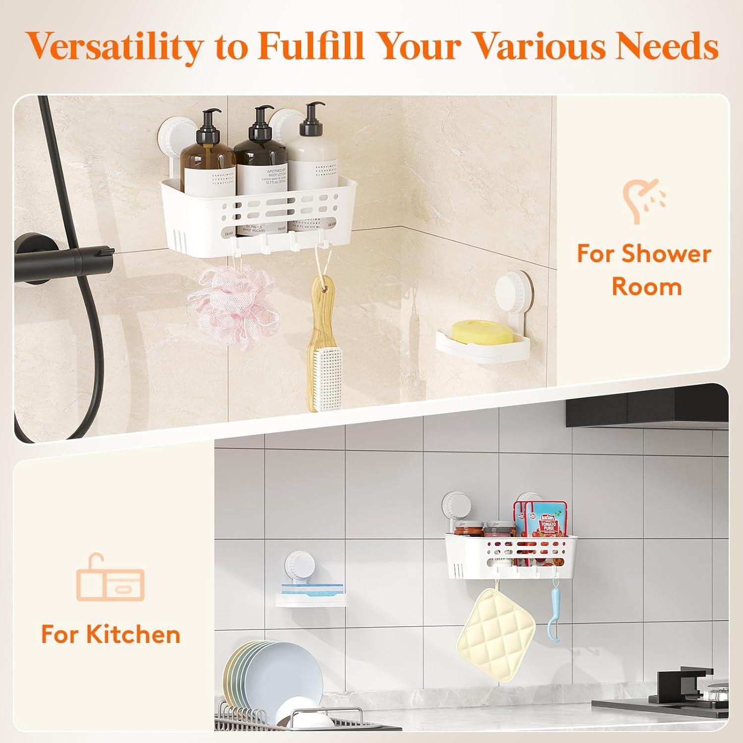 Super Strong Suction: The suction cup shower caddy set features high-quality suction cups that provide strong hold. The shower caddy can support up to 22 lbs (10 kg), while the soap dish can hold up to 11 lbs (5 kg). Both are waterproof and oil-proof, and the reusable suction cups ensure a secure hold in wet bathrooms or kitchens