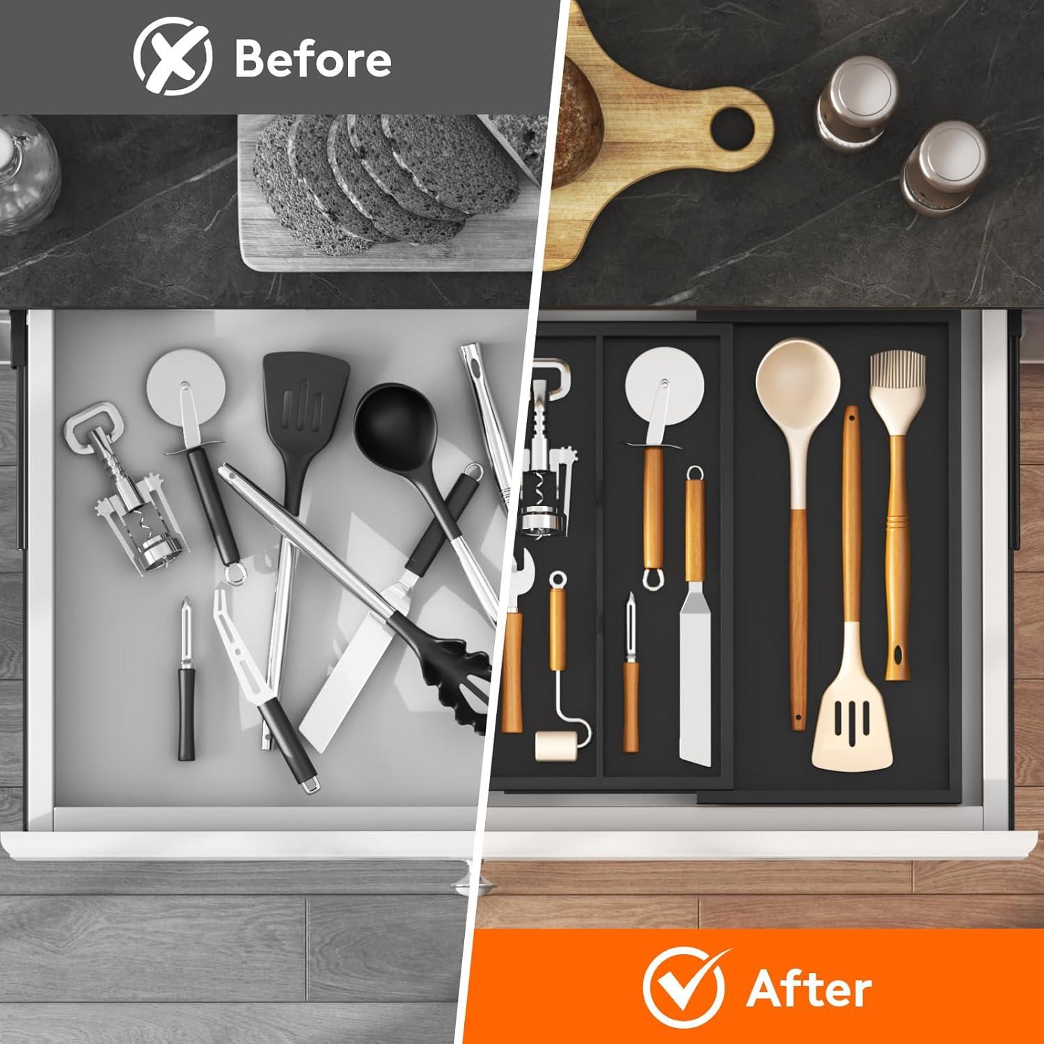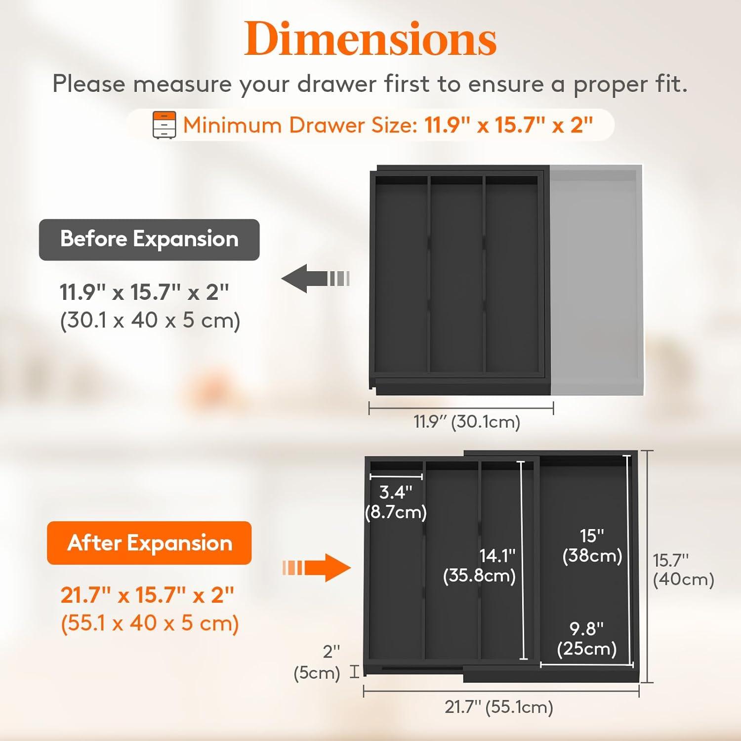 Expandable Design: This utensil drawer organizer can expand from two compartments to three and measures 15.8 x 15.7 x 2 inches after expansion, providing extra storage space. With an adjustable width range of 8.9-15.8 inches it ensures a perfect fit for most drawers