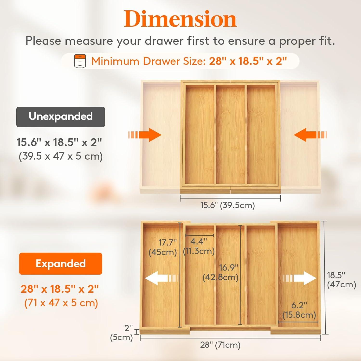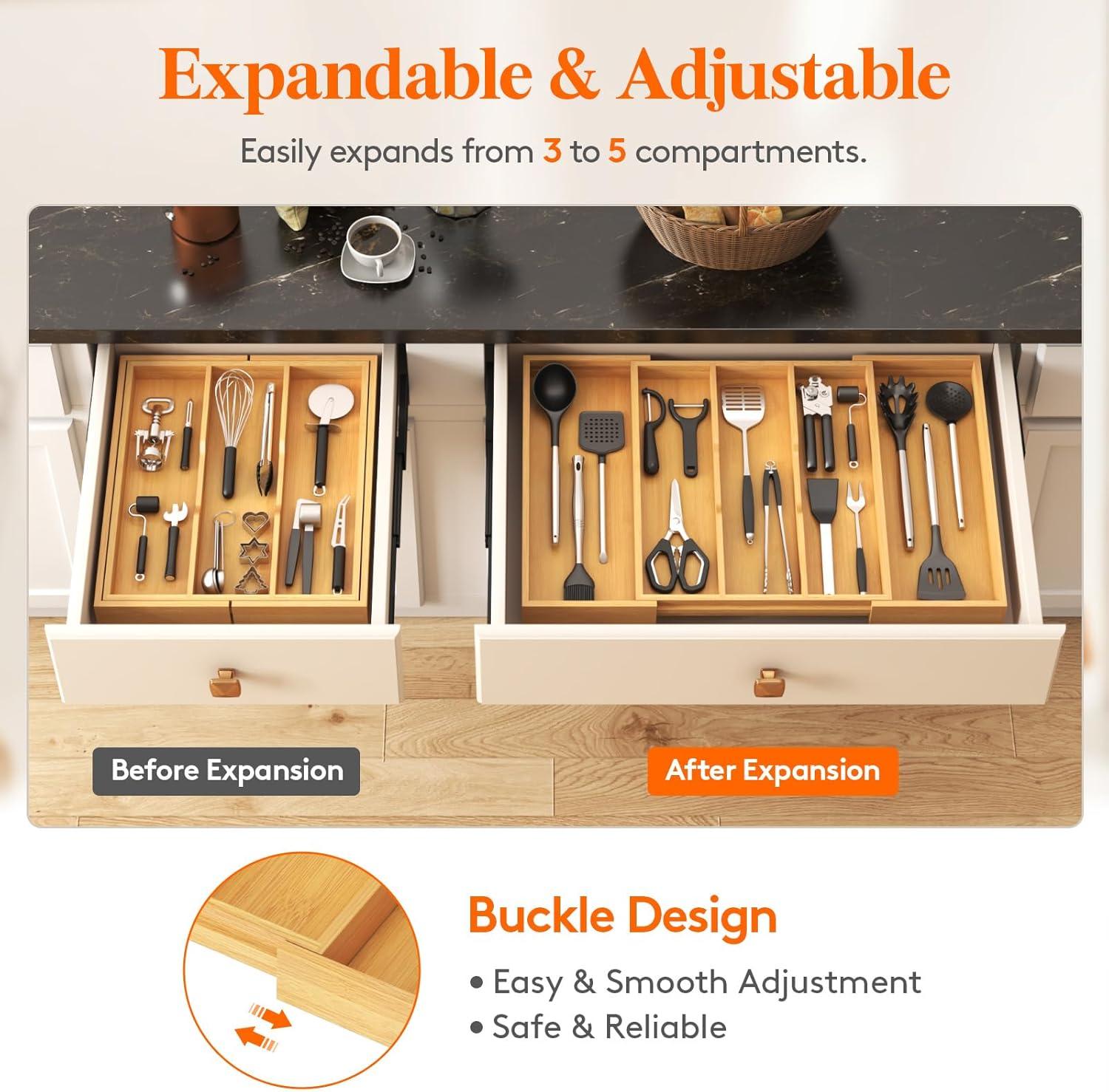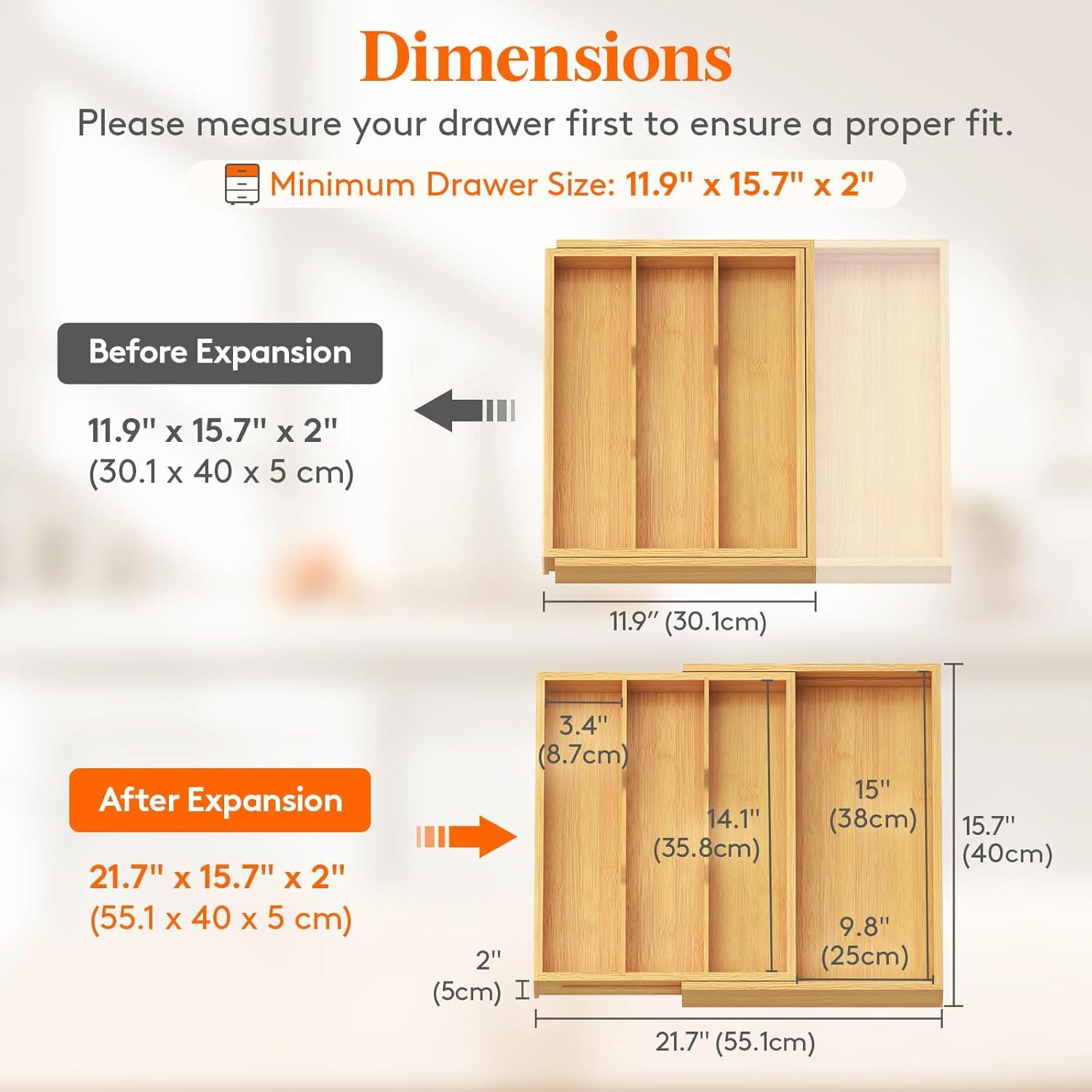 Expandable Design: This utensil drawer organizer can expand from two compartments to three and measures 15.8 x 15.7 x 2 inches after expansion, providing extra storage space. With an adjustable width range of 8.9-15.8 inches it ensures a perfect fit for most drawers