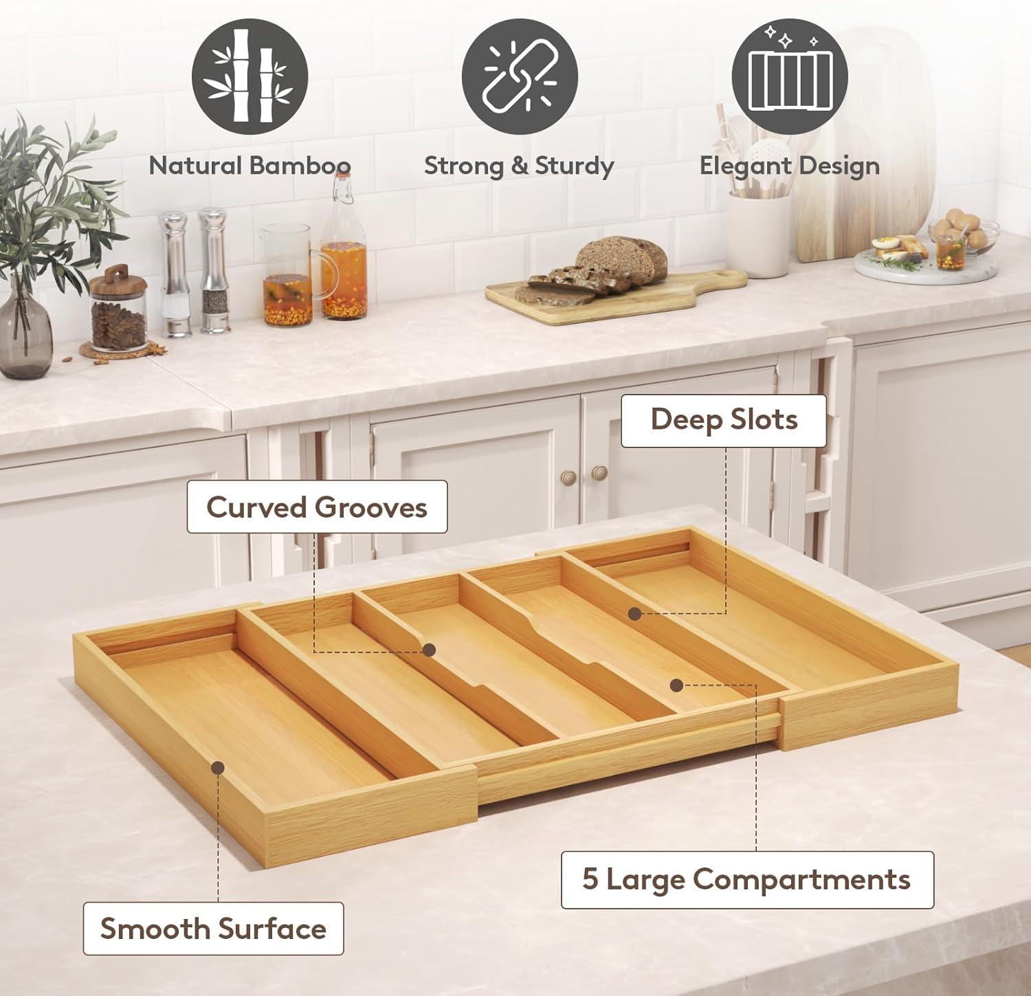 Lifewit Utensil Drawer Organizer, Expendable Cooking Silverware Tray for Kitchen Drawer, Bamboo Adjustable Cutlery Flatware Holder, Spatula Tools and Gadgets Storage Divider, 3 Compartments, Natural(Natural)