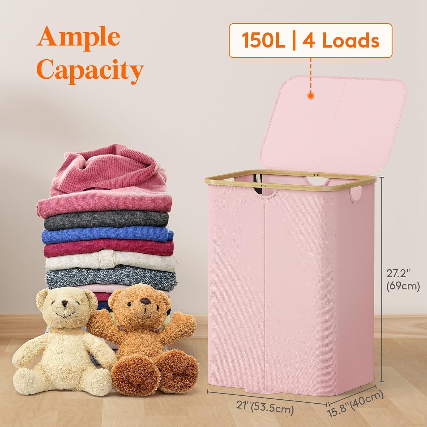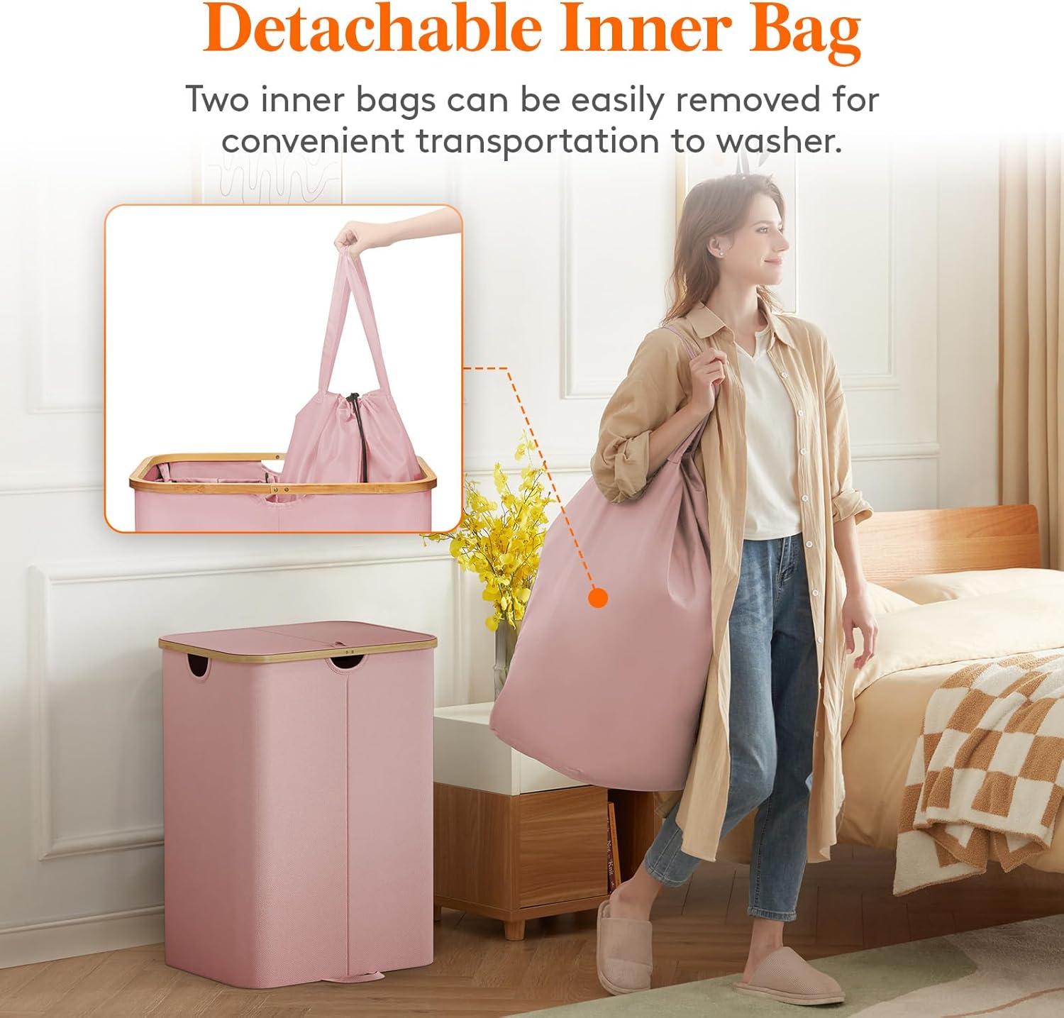 • Lifewit 120L Double Laundry Hamper with Lid, Large Dual Laundry Basket Removable Bags, 2 Sections Aesthetic Clothes Hampers for Laundry with Bamboo Handles for Bedroom Bathroom Dorm, Black(Pink)